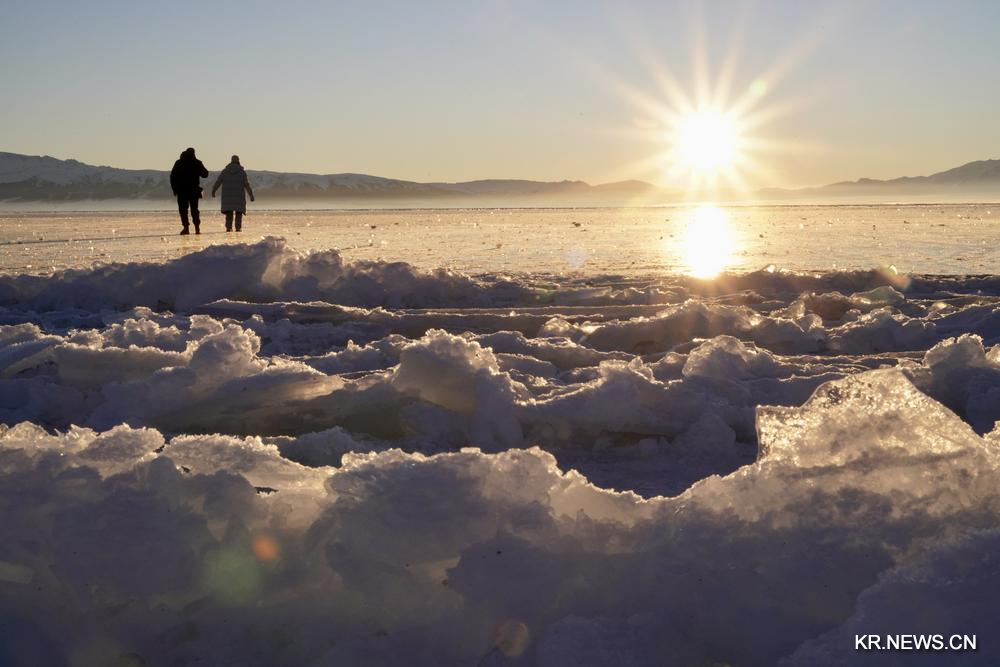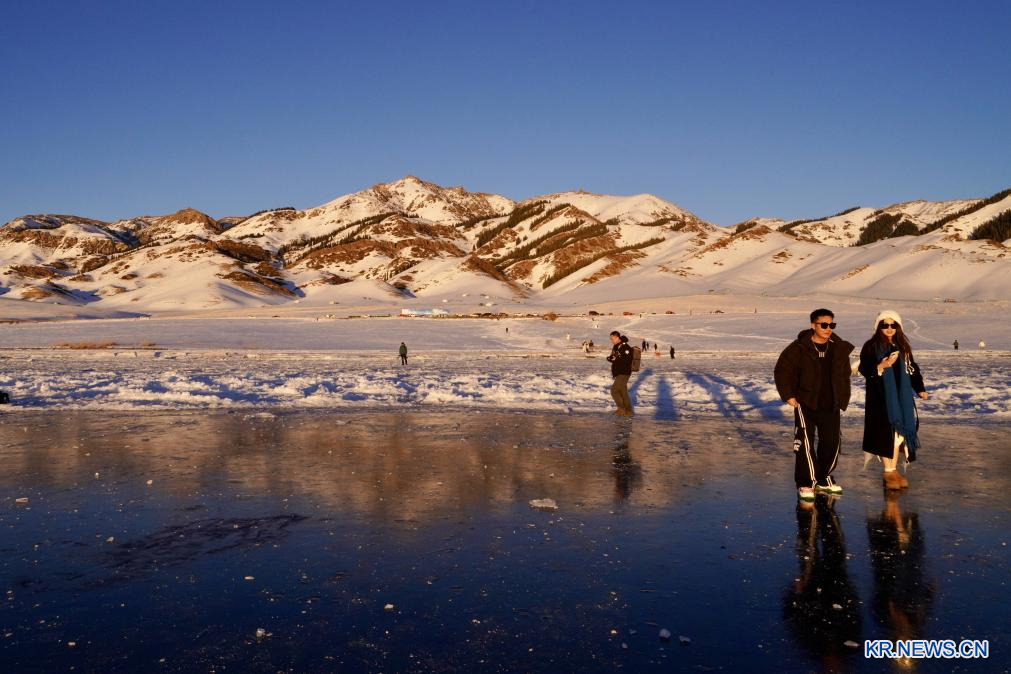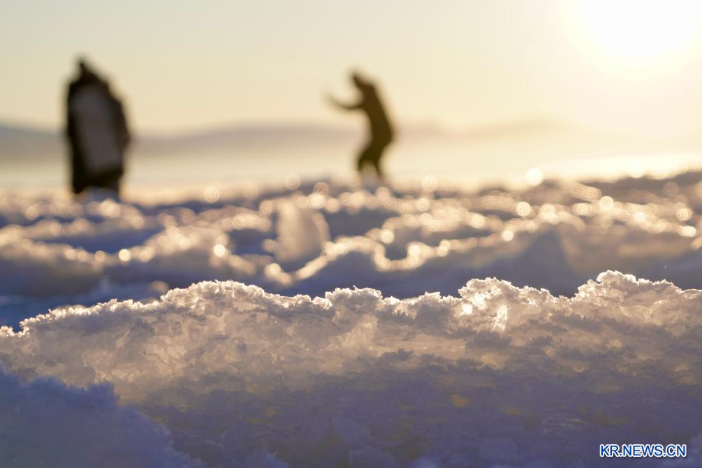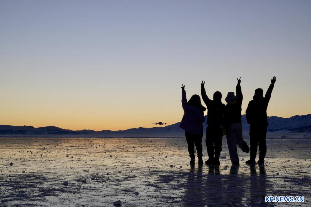 13일 해가 저무는 시간대에 싸이리무후를 찾은 관광객이 언 호수 위를 걸으며 경치를 즐기고 있다. 2025.1.13