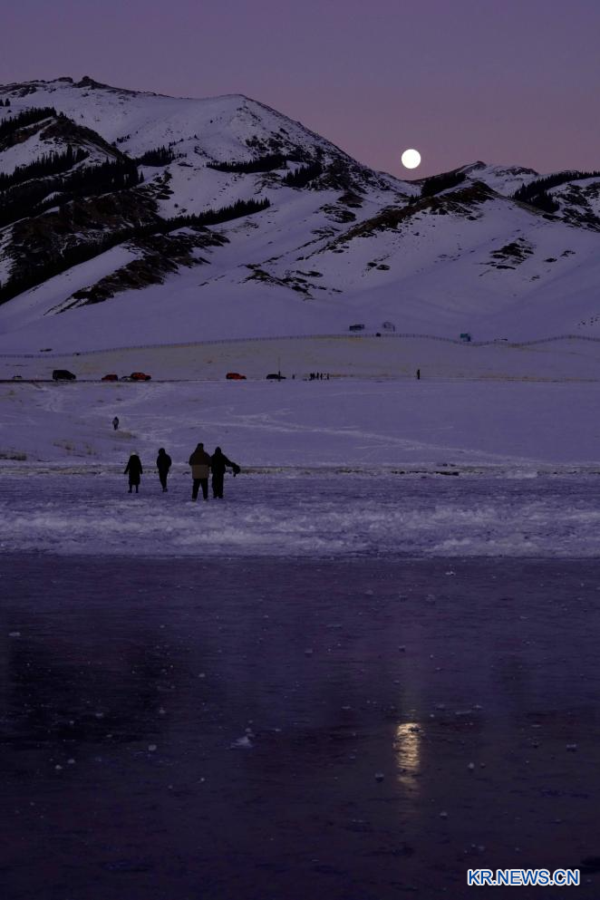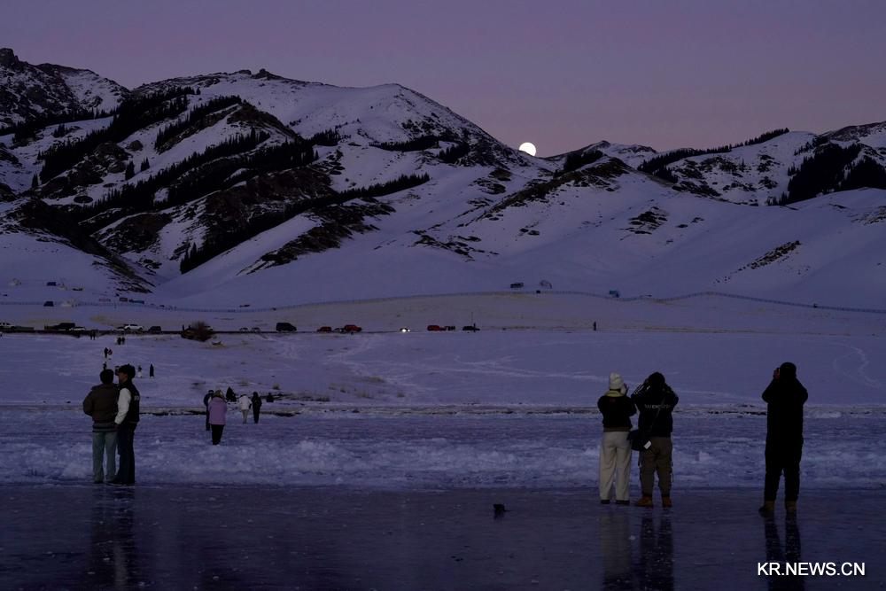 [신화망 보얼타라 1월14일] 13일 꽁꽁 언 싸이리무후(賽里木湖)를 찾은 관광객들이 해가 진 후 떠오른 달을 카메라에 담고 있다.