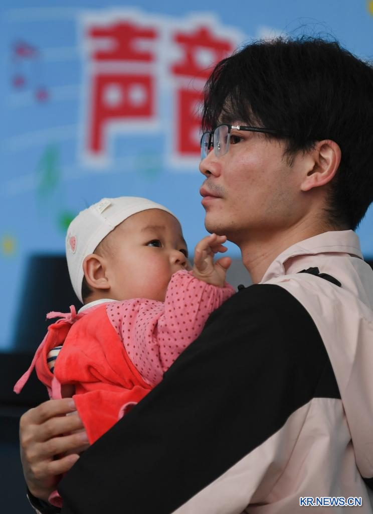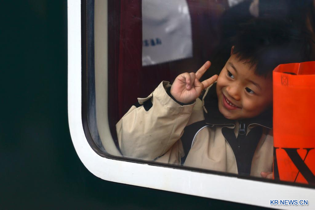 14일 상하이 훙차오(虹橋)역에서 구이양(貴陽)으로 향하는 열차에 탑승한 어린이들이 손을 흔들고 있다.