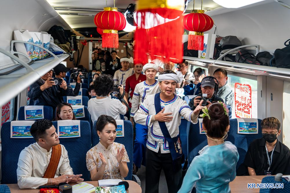 [신화망 쿤밍 1월15일] 라오스 비엔티엔으로 향하는 중국-라오스 철도 국제 여객열차 D87편이 14일 오전 쿤밍(昆明) 남역을 출발했다. 2021년 12월 3일 개통된 중국-라오스 철도는 황금 관광 노선으로 D87편에서는 다국적 문화예술 공연이 진행돼 여행에 색다른 재미를 더했다.