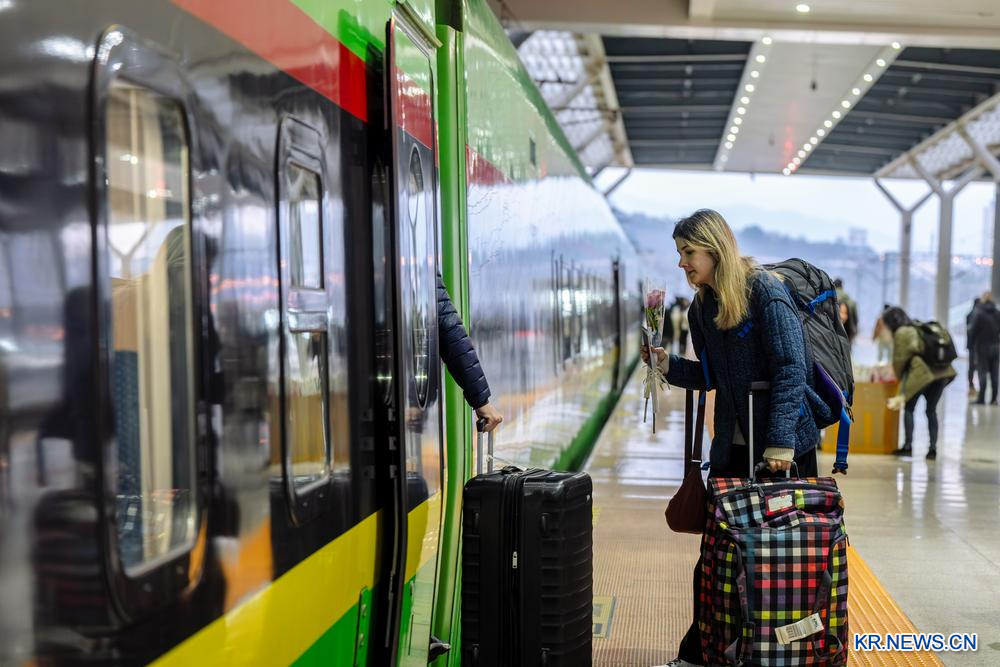 라오스 비엔티엔으로 향하는 중국-라오스 철도 국제 여객열차 D87편이 이날 오전 쿤밍(昆明) 남역을 출발했다. 2021년 12월 3일 개통된 중국-라오스 철도는 황금 관광 노선으로 D87편에서는 다국적 문화예술 공연이 진행돼 여행에 색다른 재미를 더했다. 2025.1.14
