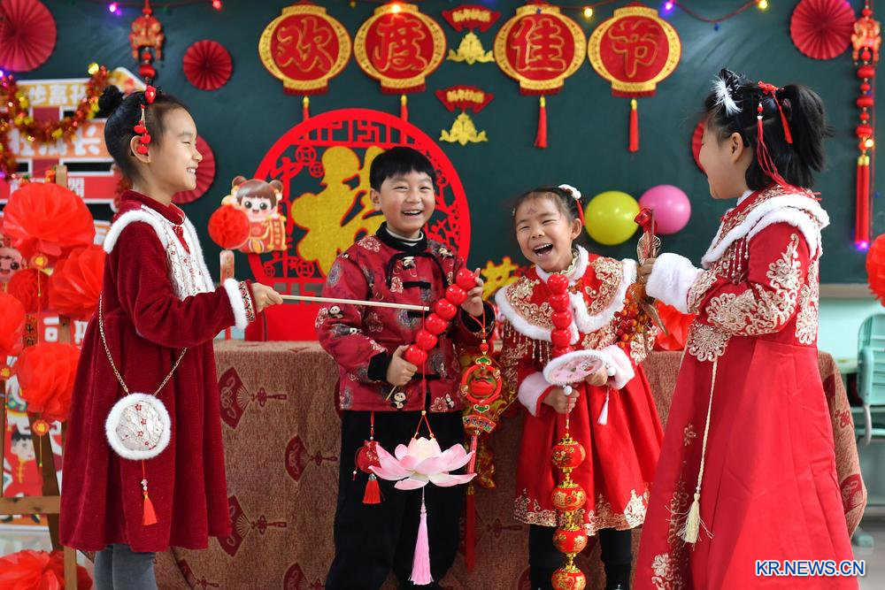 14일 산둥(山東)성 칭다오(青島)시의 한 초등학교서 열린 새해맞이 테마행사에서 초등학생들이 전통 공연을 선보이고 있다. 2025.1.14