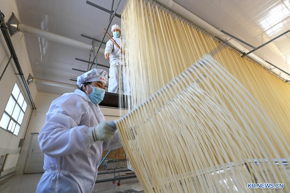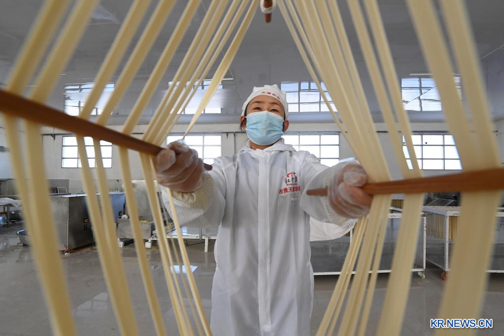 [신화망 우웨이 1월17일] 16일 간쑤(甘肅)성 우웨이(武威)시 구랑(古浪)현의 한 수제건면 생산 작업장에서 면발을 뽑는 직원.
