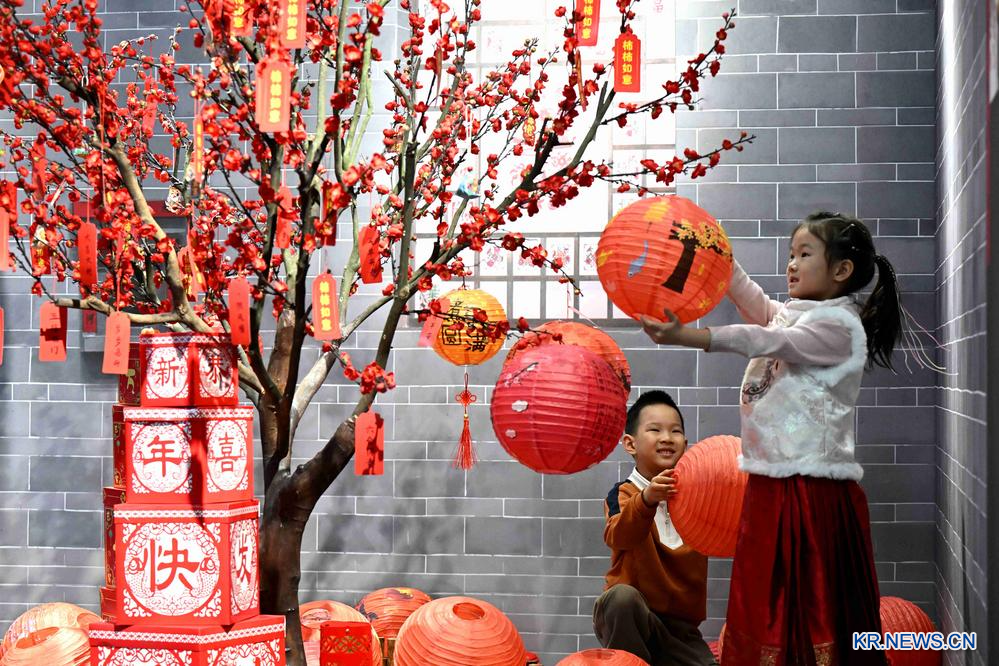16일 허베이성 군중예술관의 새해맞이 민속문화 전시 행사에서 등롱을 걸고 있는 어린이. 2025.1.16