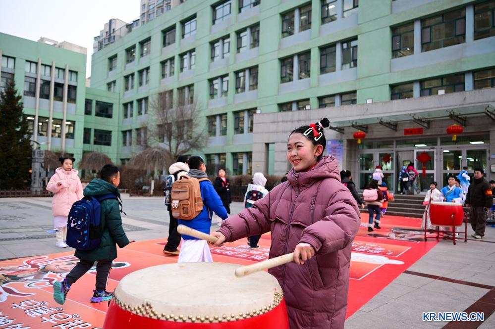 23일 시닝시의 한 초등학교 학생이 '너자(哪吒)' 분장을 한 채 북을 치며 새 학기를 맞은 학생들을 환영했다. 2025.2.23