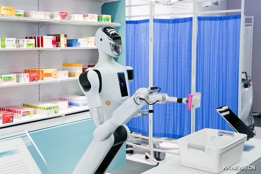 [신화망 베이징 2월26일] 24일 베이징 '로봇대세계'에 전시된 인허(銀河·GALBOT) 범용 로봇이 약국 무인 당직 시나리오를 시연하고 있다.