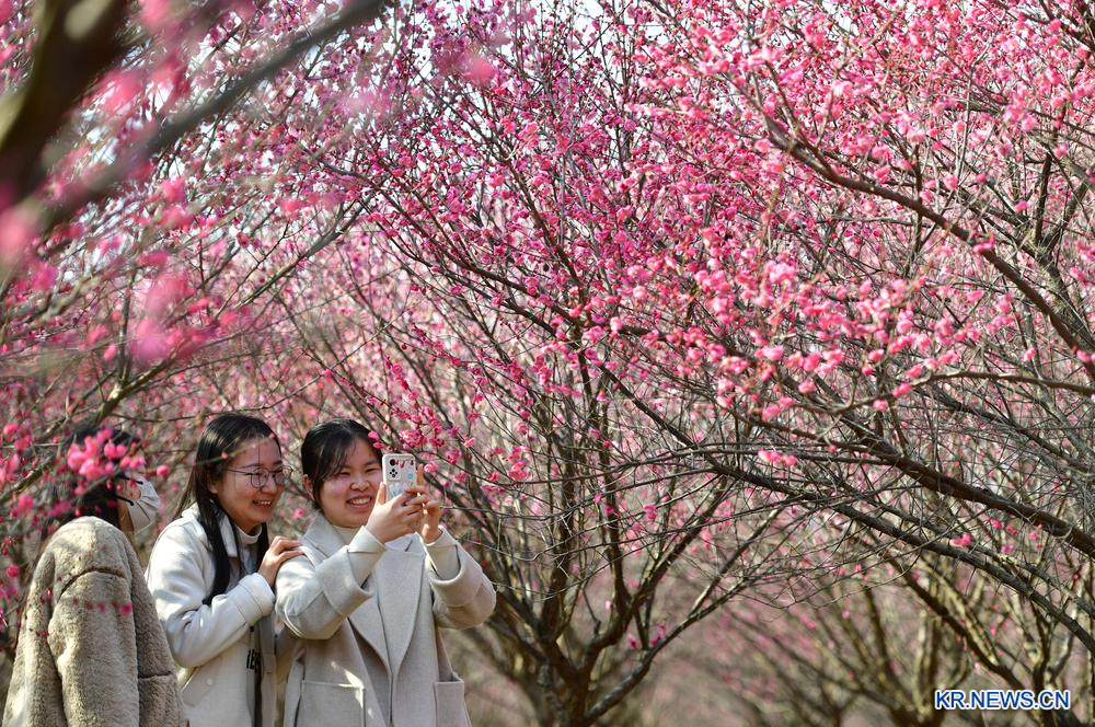 27일 후베이(湖北)성 우한(武漢)시 황피(黃陂)구의 한 관광지에서 매화를 감상하고 있는 여행객. 2025.2.27