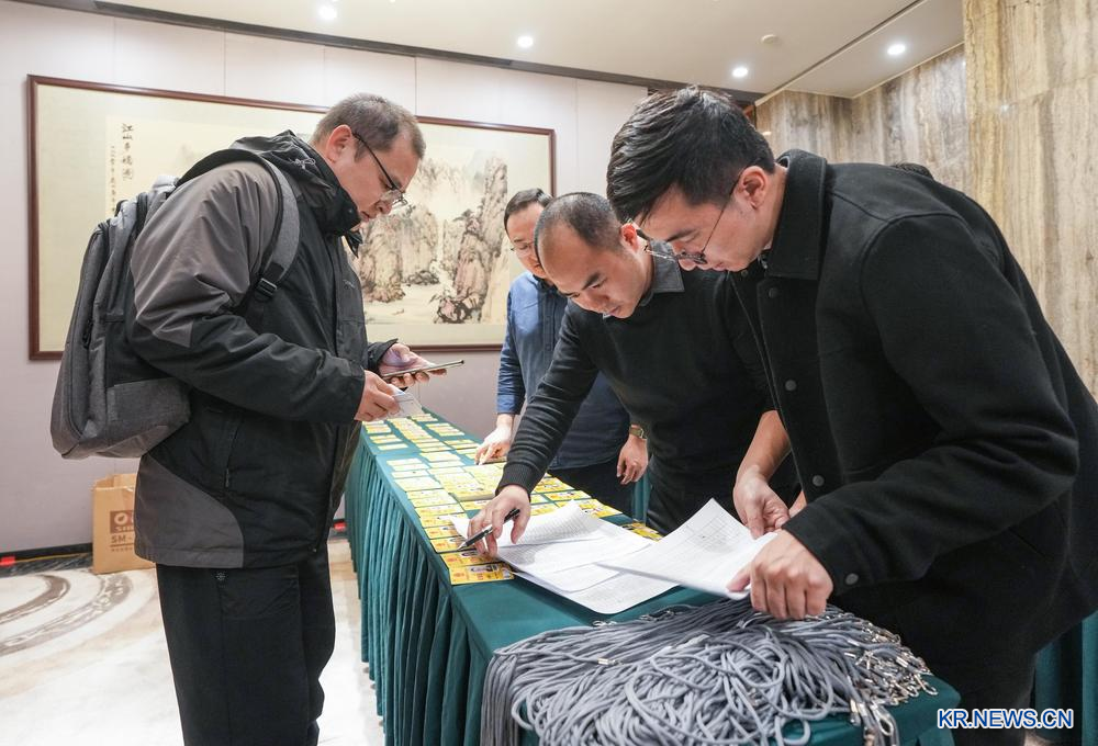 27일 한 기자가 전국 양회(兩會·전국인민대표대회와 중국인민정치협상회의) 프레스센터에서 기자증을 수령하고 있다.