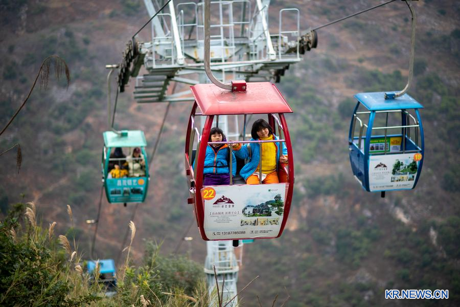 [신화망 쿤밍 2월28일] 지난 23일, 윈난(雲南)성 쉬안웨이(宣威)시 푸리(普立)향 관자이완(官寨完) 초등학교가 개학을 맞았다. 천훙한(陳泓函)은 관광지 셔틀버스를 타고 수직 268m 길이에 달하는 관광 엘리베이터를 갈아탄 후 케이블카로 200여m를 더 올라갔다. 그 후 1㎞ 정도를 더 걸어 약 30분 만에 학교에 도착했다.