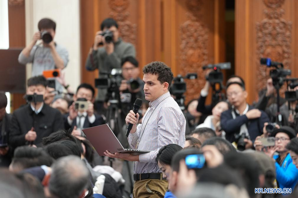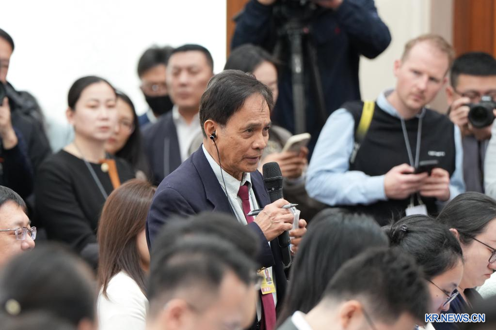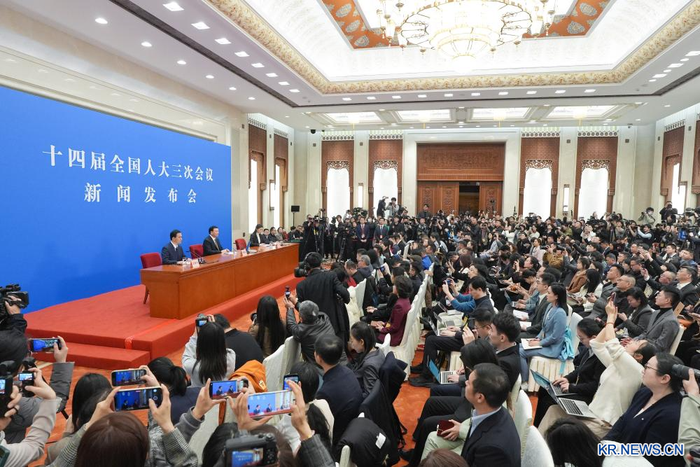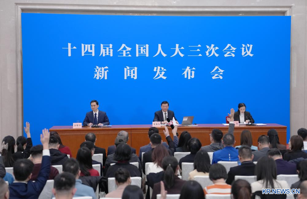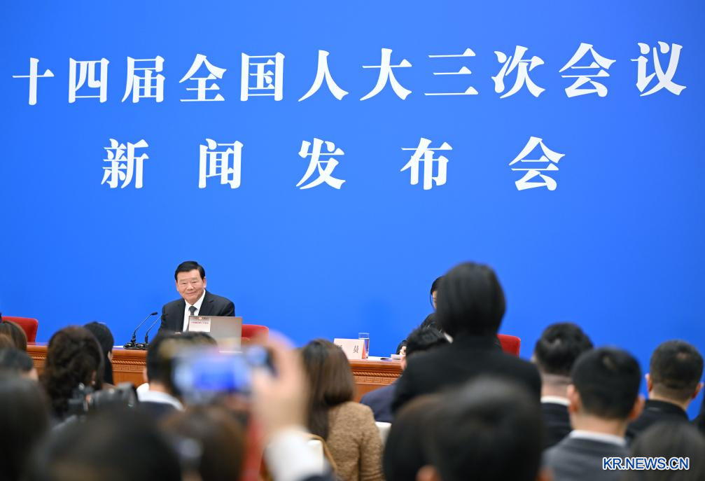 제14기 전국인민대표대회(전인대) 제3차 회의 기자회견이 4일 베이징 인민대회당에서 열렸다. 러우친젠(婁勤儉) 대회 대변인은 대회 어젠다 및 전인대 업무와 관련해 중국 국내외 기자들의 질문에 답변했다.[촬영/신화사 기자 류다웨이(劉大偉)]