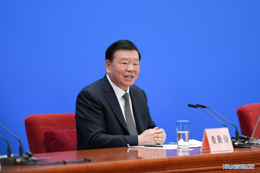 [신화망 베이징 3월4일] 제14기 전국인민대표대회(전인대) 제3차 회의 기자회견이 4일 베이징 인민대회당에서 열렸다. 러우친젠(婁勤儉) 대회 대변인은 대회 어젠다 및 전인대 업무와 관련해 중국 국내외 기자들의 질문에 답변했다.[촬영/신화사 기자 정환쑹(鄭煥松)]