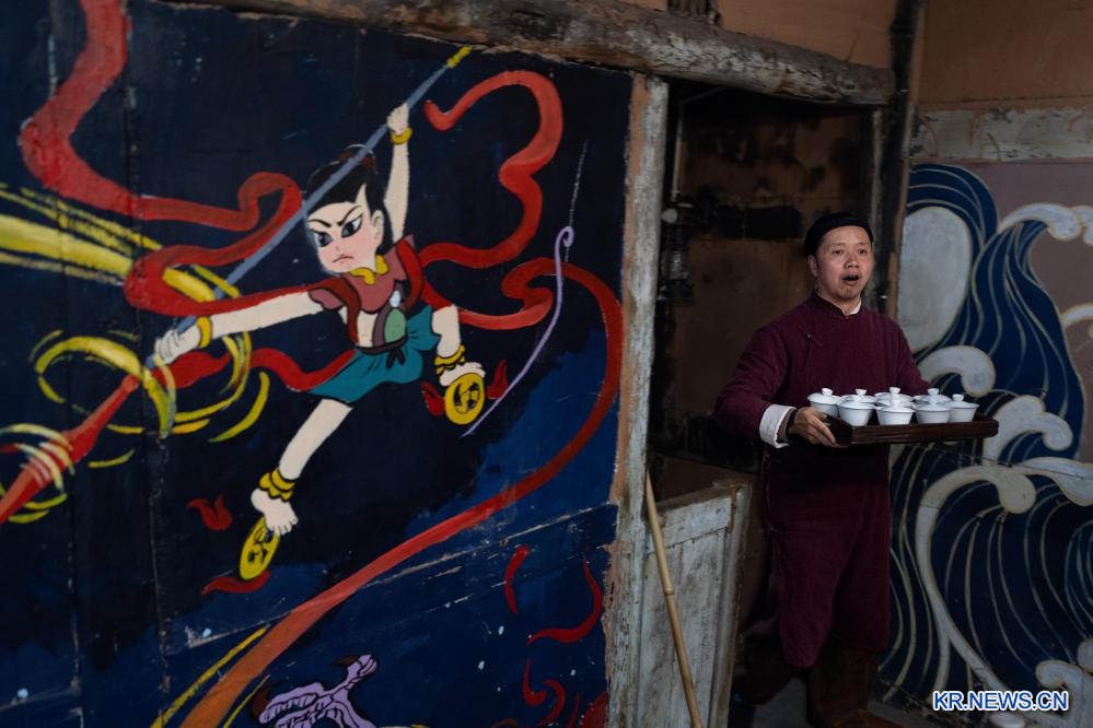 [신화망 쉬저우 3월4일] 쓰촨(四川)성 이빈(宜賓)시 니시(泥溪)진에는 '너자(哪吒)' 테마 찻집인 쿤룽창(坤隆昌)이 있다. 찻집 입구에는 너자 채색화가 걸려 있고 안에는 수 미터에 달하는 벽화가 펼쳐져 있다. 이곳의 너자 테마 벽화는 미술을 전공한 대학생들이 중국 고전소설 '봉신연의(封神演義)'를 참고해 그렸다. 국산 애니 '너자2' 열풍이 일자 이곳 찻집도 인기 명소로 떠올랐다.