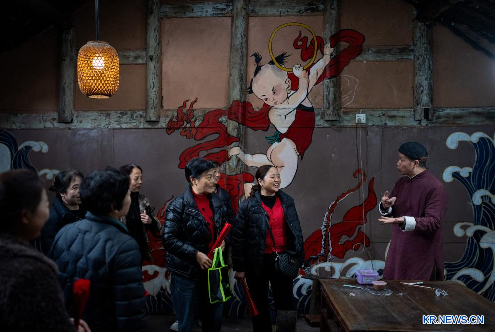2일 쓰촨(四川)성 이빈(宜賓)시 니시(泥溪)진에 위치한 찻집 쿤룽창(坤隆昌)에서 너자(哪吒) 벽화와 사진을 찍는 관광객.