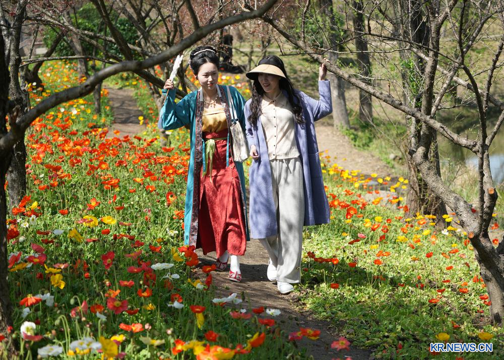 [신화망 항저우 3월25일] 24일 저장(浙江)성 항저우(杭州)시 시시(西溪)습지의 오솔길에서 개양귀비를 감상하는 관광객.