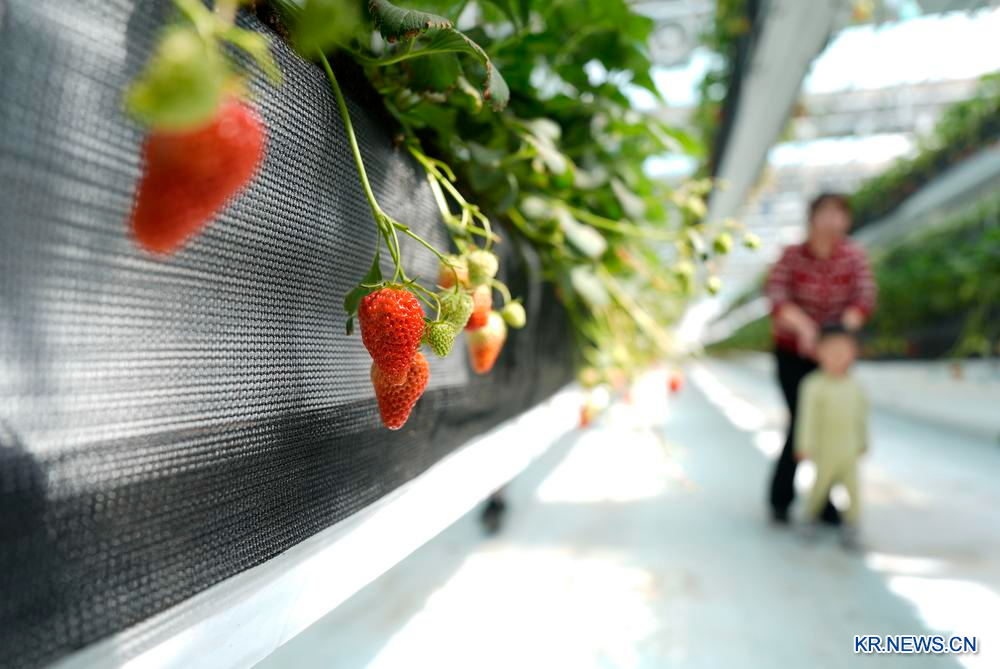 [신화망 인촨 4월7일] 6일 닝샤(寧夏)회족자치구 인촨(銀川)시 허란(賀蘭)현 톈룽(天榮) 민속생태원에서 딸기를 수확하는 시민들.