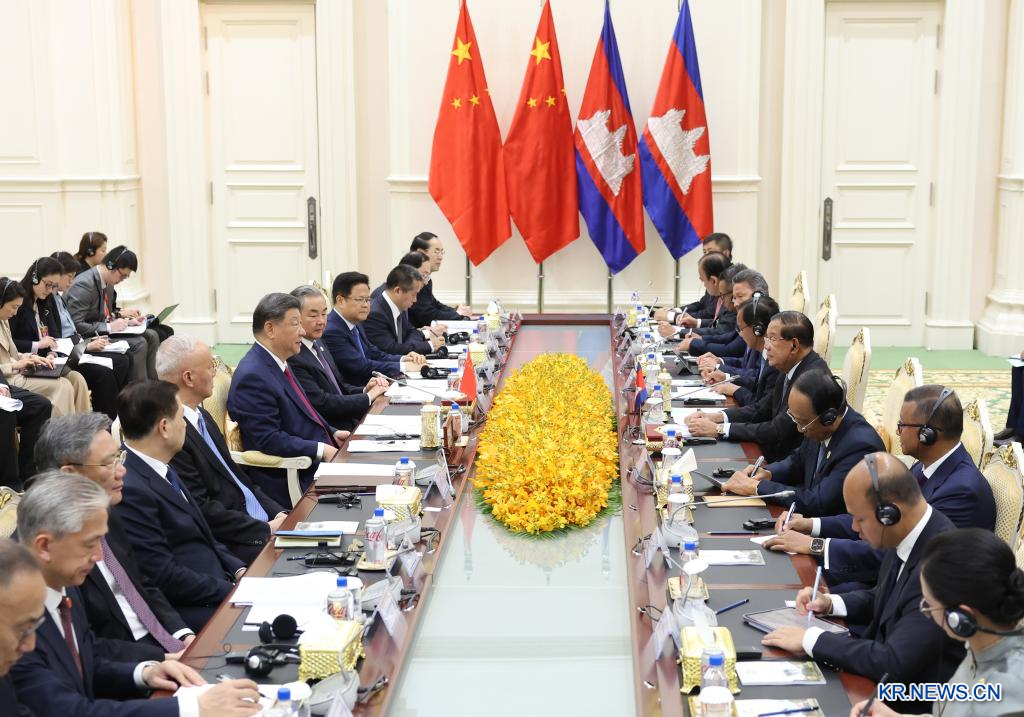 시진핑(習近平) 국가주석이 17일 오후 프놈펜 평화궁에서 훈센 캄보디아 인민당 주석, 상원의장과 회견했다.[촬영/신화사 기자 딩하이타오(丁海濤)]