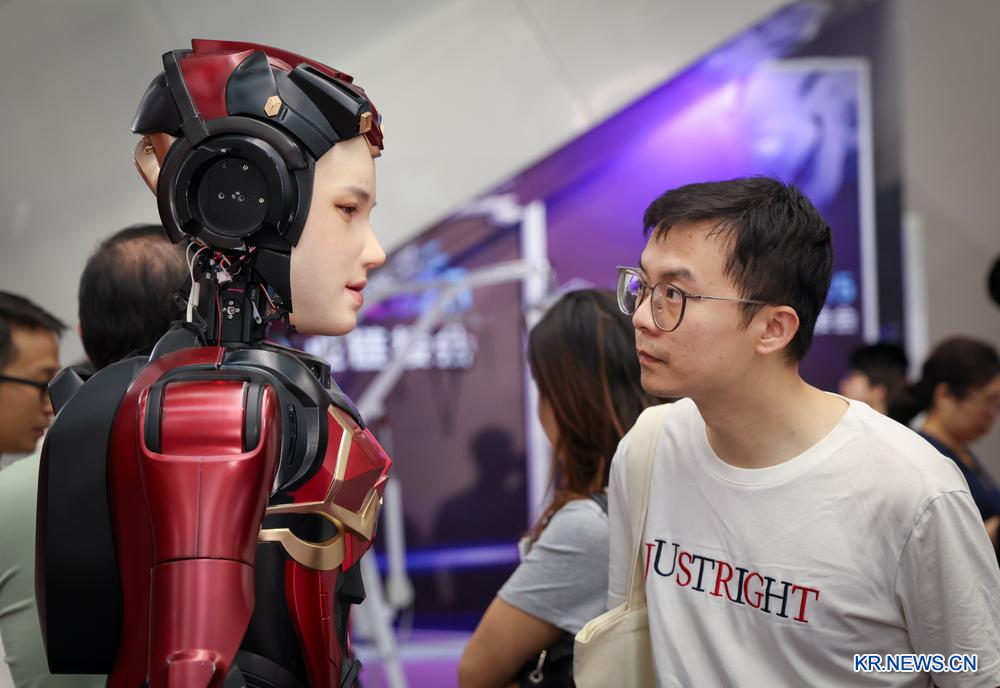 24일 '제1회 로봇 전체 산업사슬 교류회(FAIR plus 2025)' 디지털화샤(華夏)테크 전시 부스에서 한 관람객이 감정 상호작용 능력을 갖춘 휴머노이드 로봇을 살펴보고 있다.