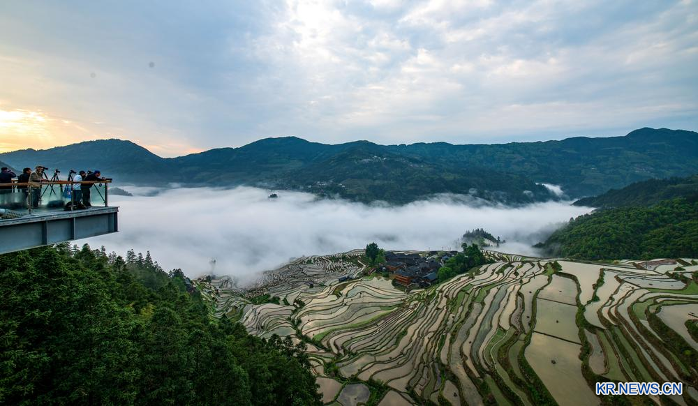 [신화망 첸둥난 4월29일]구이저우(貴州)성 첸둥난(黔東南)먀오(苗)족둥(侗)족자치주 충장(從江)현의 계단식 밭이 봄 농사철에 접어들어 분주한 정경이 연출됐다.