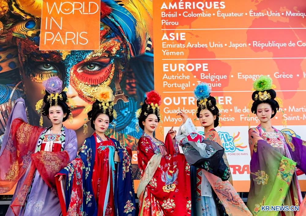 [신화망 파리 5월1일] 4월 30일 파리종합전시회(Foire de Paris) 현장에서 당나라 여성 복장을 한 중국 측 전시 참가자들이 단체사진을 찍고 있다.