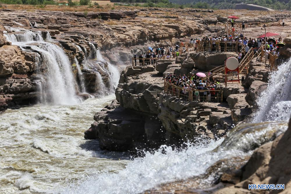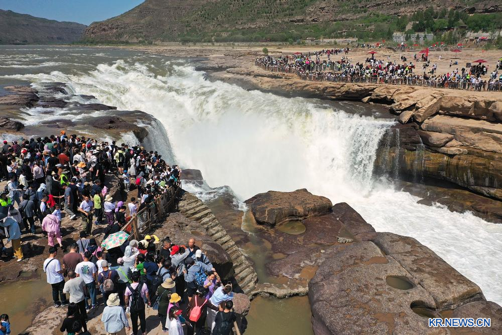 국경절 연휴 기간 산시(陜西)성 이촨(宜川)현과 산시(山西)성 지(吉)현 경계 지역에 위치한 황허 후커우 폭포가 장관을 이루자 많은 관광객의 발걸음이 이어졌다. 2025.5.2