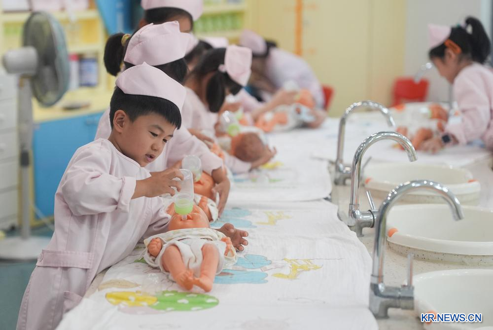 [신화망 항저우 6월3일] 2일 어린이들이 저장(浙江)성 항저우(杭州)청소년활동센터에서 '신생아 돌보기' 체험을 하고 있다.