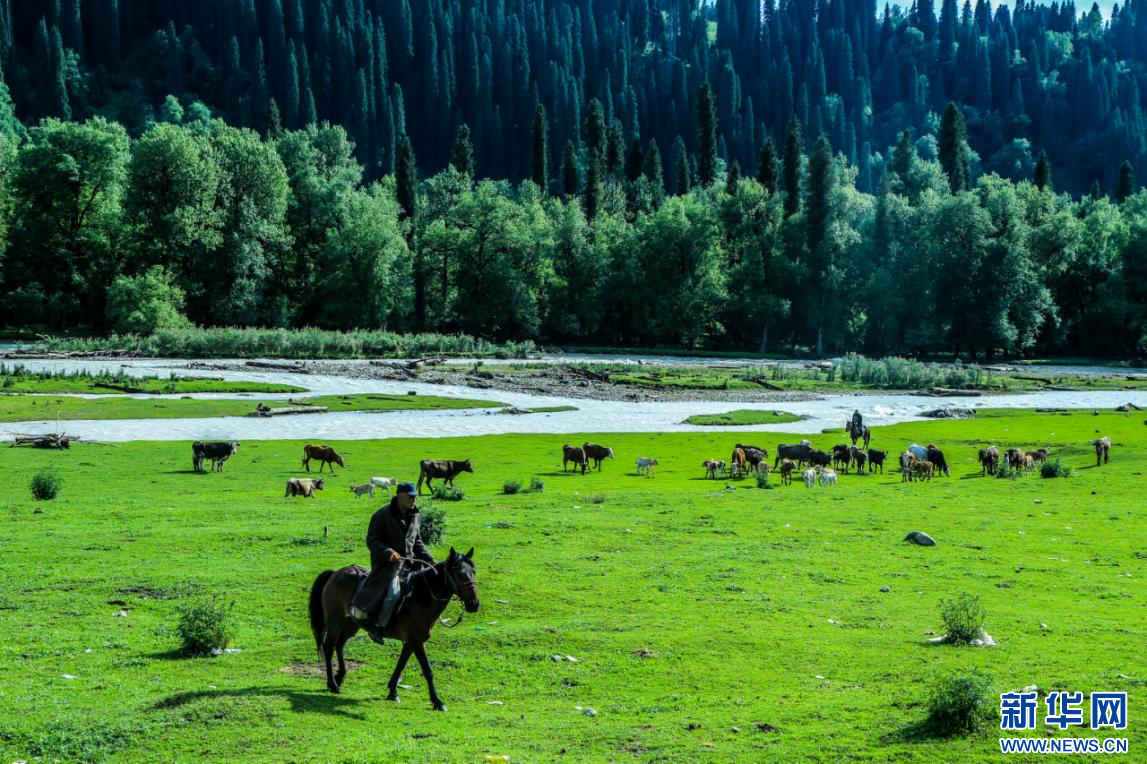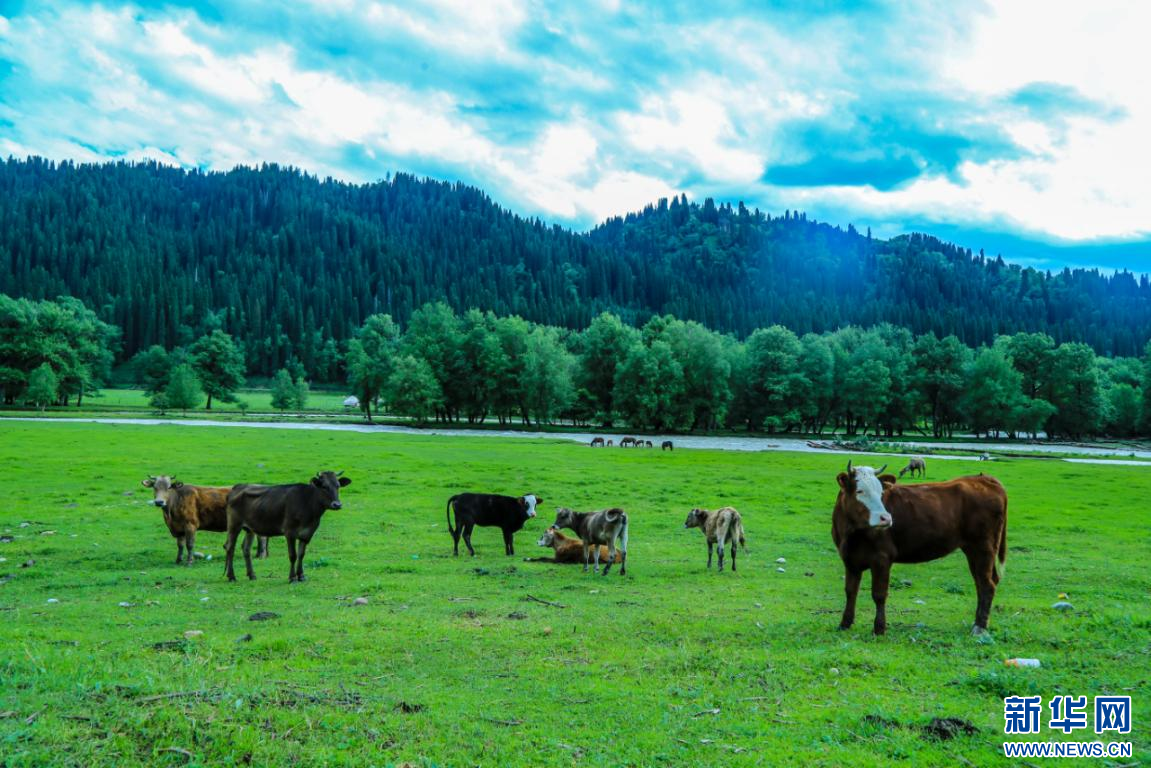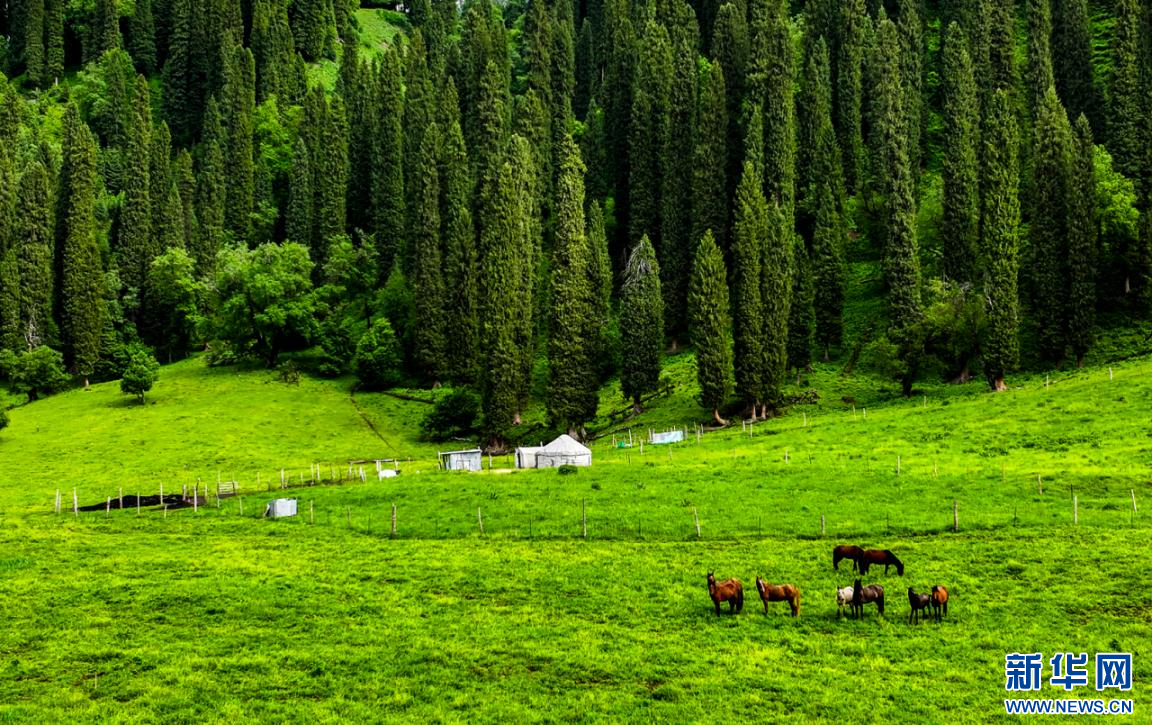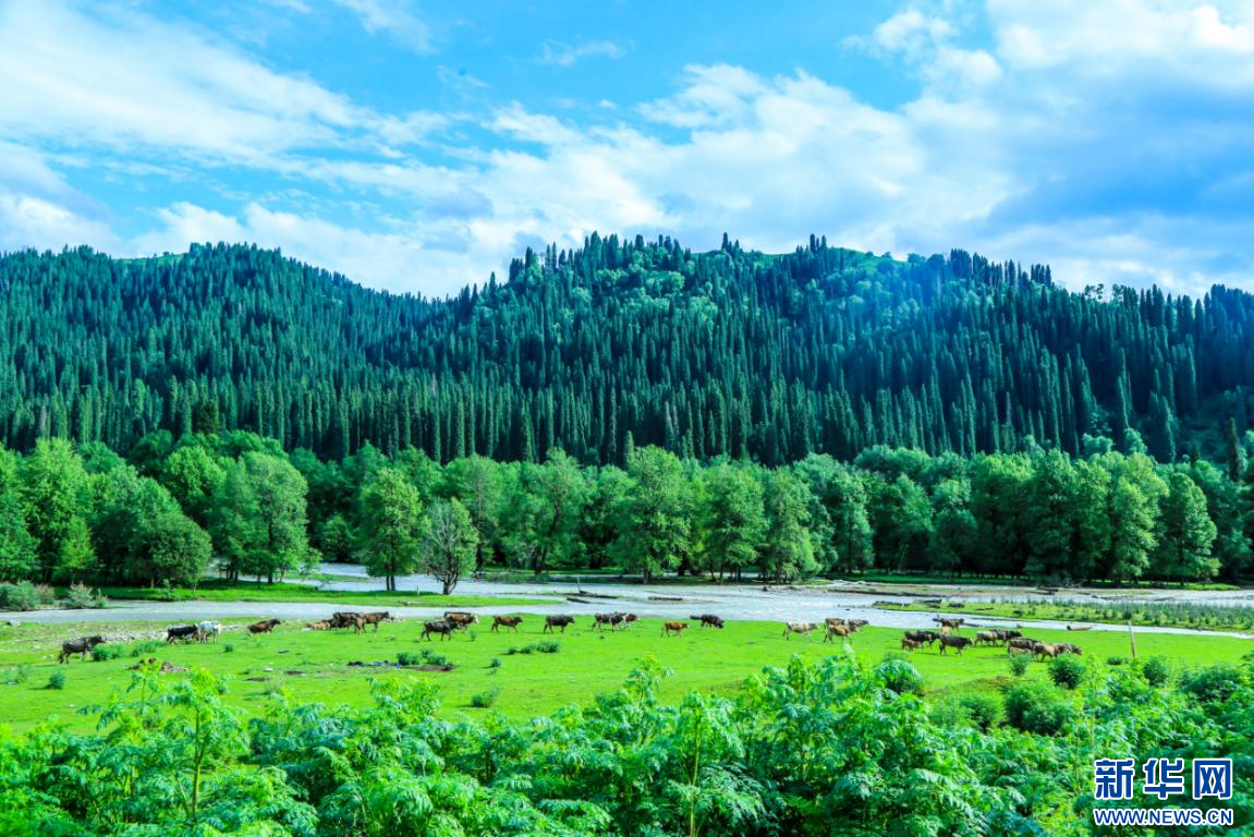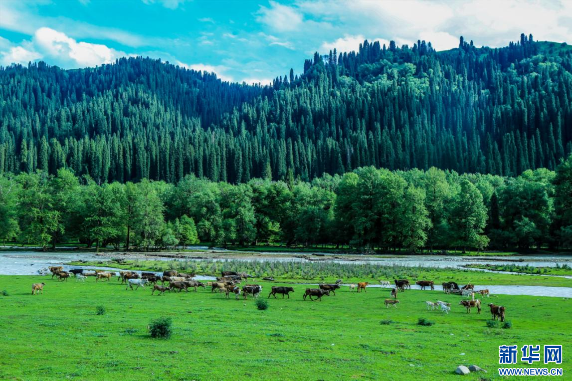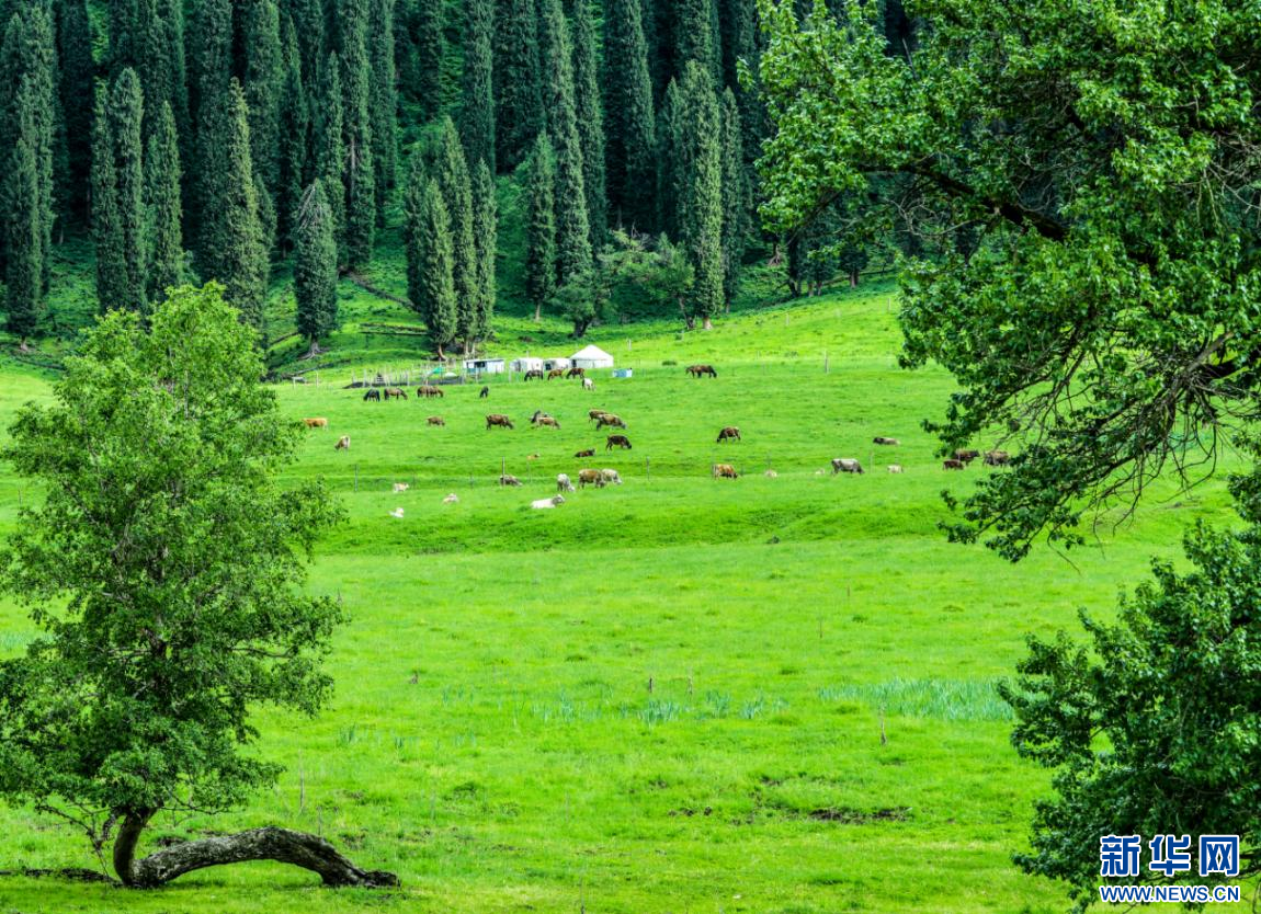 [신화망 베이징 6월5일] 신장(新疆)위구르자치구 신위안(新源)현 싸하(萨哈) 관광지에 들어서면 워얼타타우샤(沃爾塔塔吾夏) 목장이 시적 정취가 물씬한 한 폭의 그림처럼 유려하게 펼쳐진다. 광활한 들판이 끝없이 펼쳐져 있고 벽옥으로 짠 융단을 방불케 하는 연녹색 풀들이 미풍에 물결처럼 살랑거린다. 소떼와 양떼가 고개를 숙이고 한가로이 풀을 뜯는 모습이 이 초원에 생동감을 더한다.