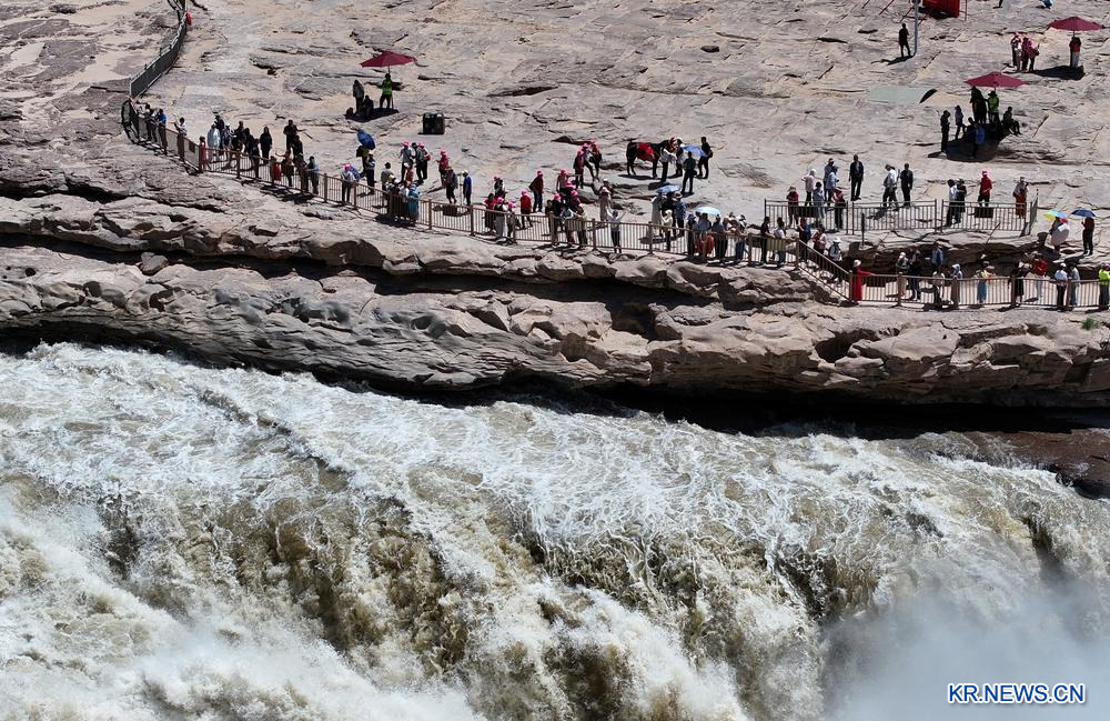 [신화망 이촨 6월5일] 산시(山西)성 린펀(臨汾)시와 산시(陝西)성 옌안(延安)시 교차점에 있는 황허(黃河) 후커우(壺口) 폭포 관광지에 여름이 찾아왔다. 거친 폭포수가 만든 절경에 많은 관광객의 발걸음이 이어지고 있다.