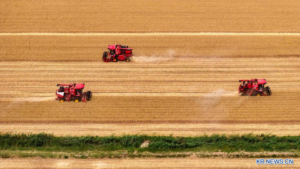 [신화망 지닝 6월6일] 여름철 농사가 본격화되자 산둥(山東)성 지닝(濟寧)시 자샹(嘉祥)현의 대규모 밀밭이 수확으로 분주한 모습이다. 현지 농가는 맑은 날씨를 틈타 밀을 수확하고 가을 곡식을 파종하며 구슬땀을 흘리고 있다.