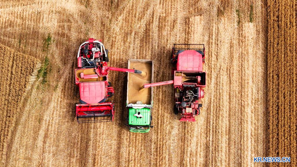 5일 산둥(山東)성 지닝(濟寧)시 자샹(嘉祥)현에서 수확기가 거둔 밀을 차에 싣고 있는 모습을 드론으로 담았다.