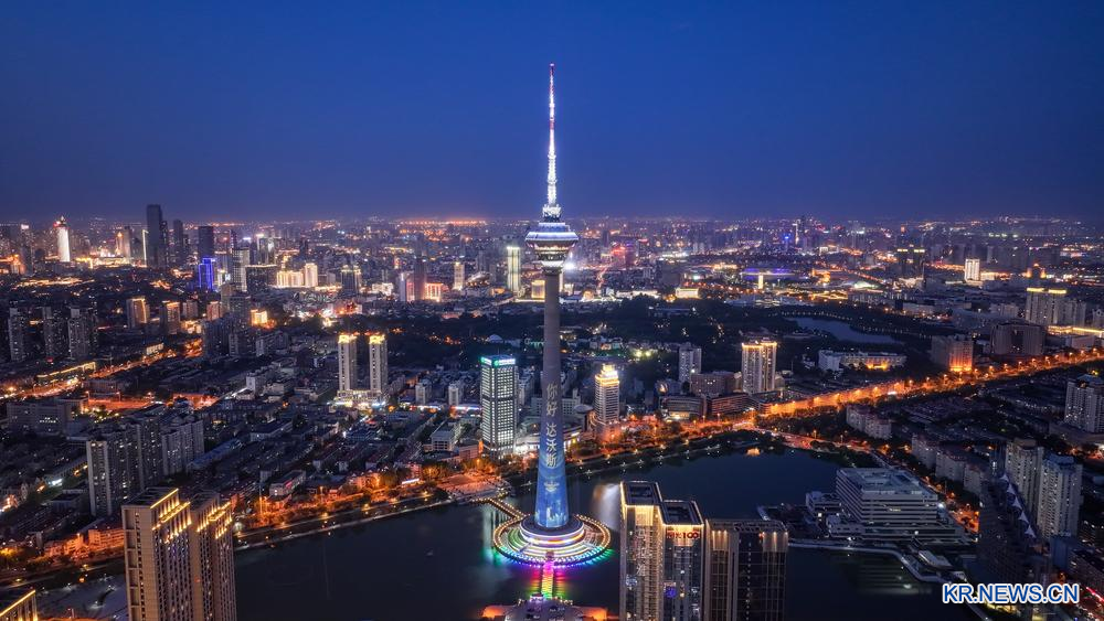 환한 조명을 밝힌 톈진 라디오텔레비전타워를 22일 드론으로 포착했다. 2025.6.23