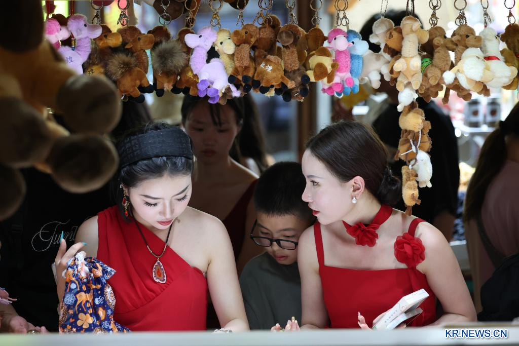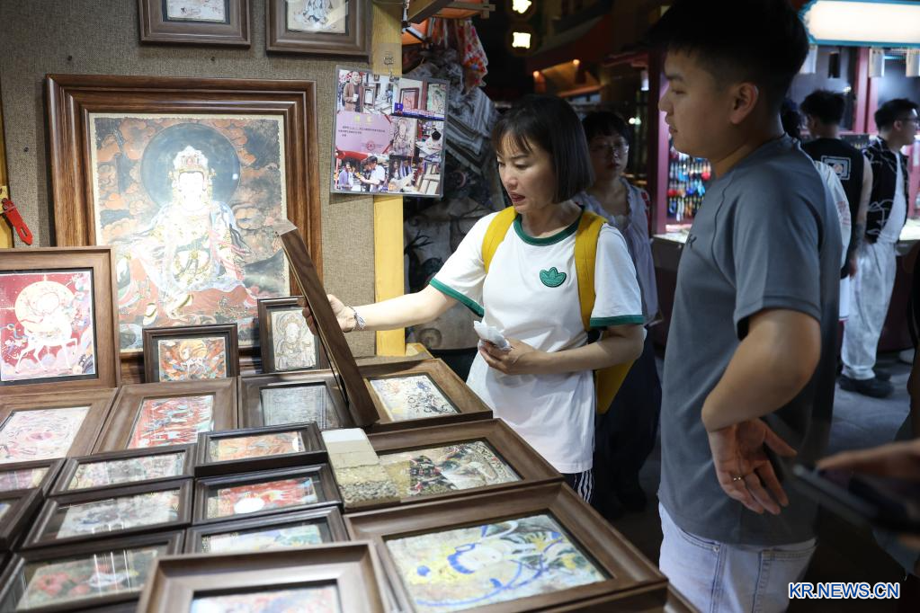 26일 저녁, 여행객이 둔황(敦煌) 야시장에서 특색 상품을 구매하고 있다.