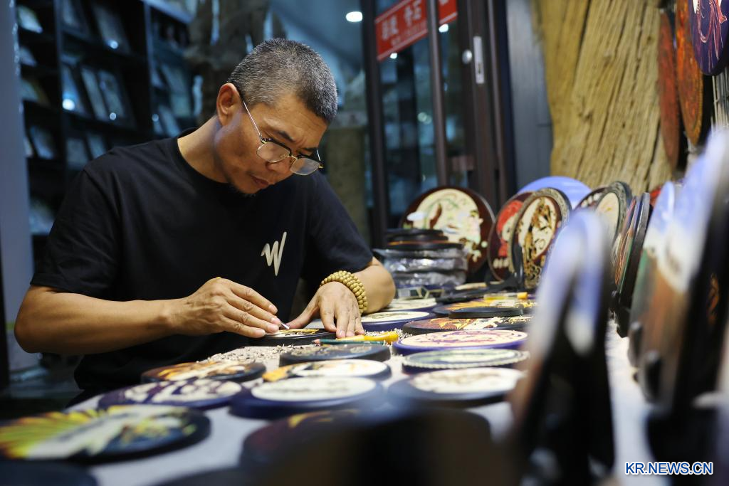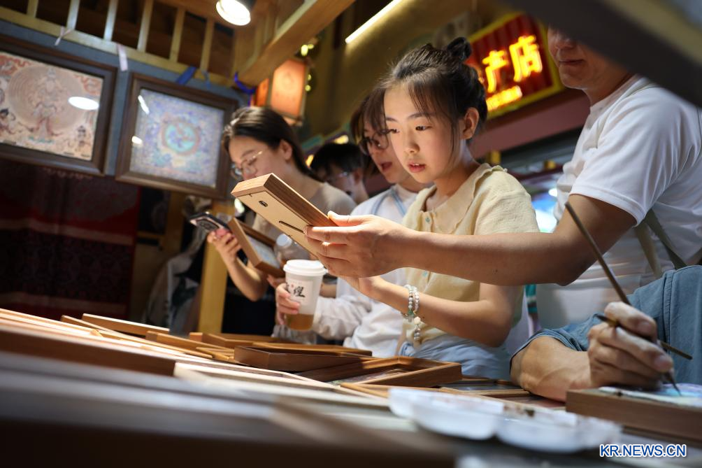 26일 저녁 둔황 야시장의 한 노점상이 둔황 특색의 문화 크리에이티브 상품을 만들고 있다.