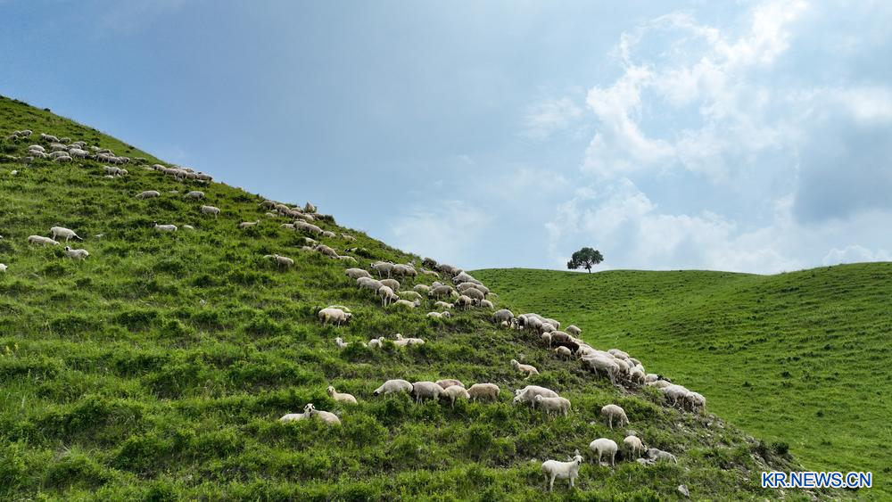 4일 네이멍구 우란마오두 초원에서 노니는 양 떼를 드론으로 내려다봤다. 2025.7.5