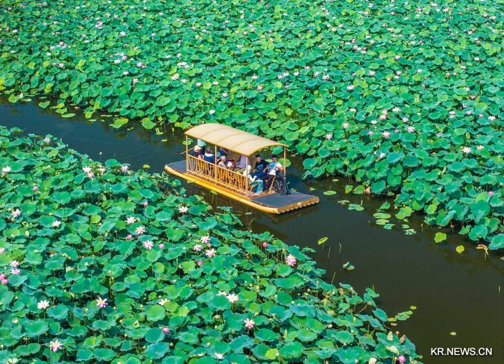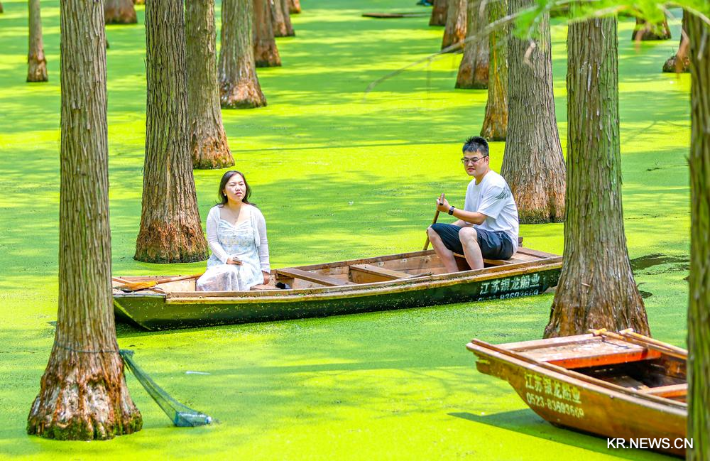 관광객이 6일 장쑤(江蘇)성 양저우(揚州)시 뤼양후(淥洋湖)습지공원에서 뱃놀이를 즐기고 있다.