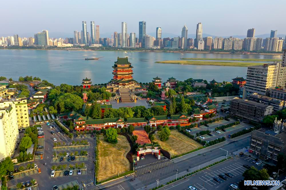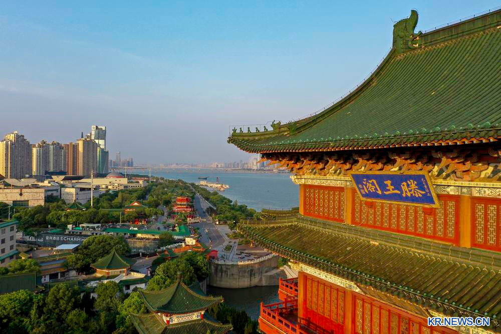 아침 햇살이 비치는 장시(江西)성 난창(南昌) 텅왕거(滕王閣)관광지를 7일 드론에 담았다.