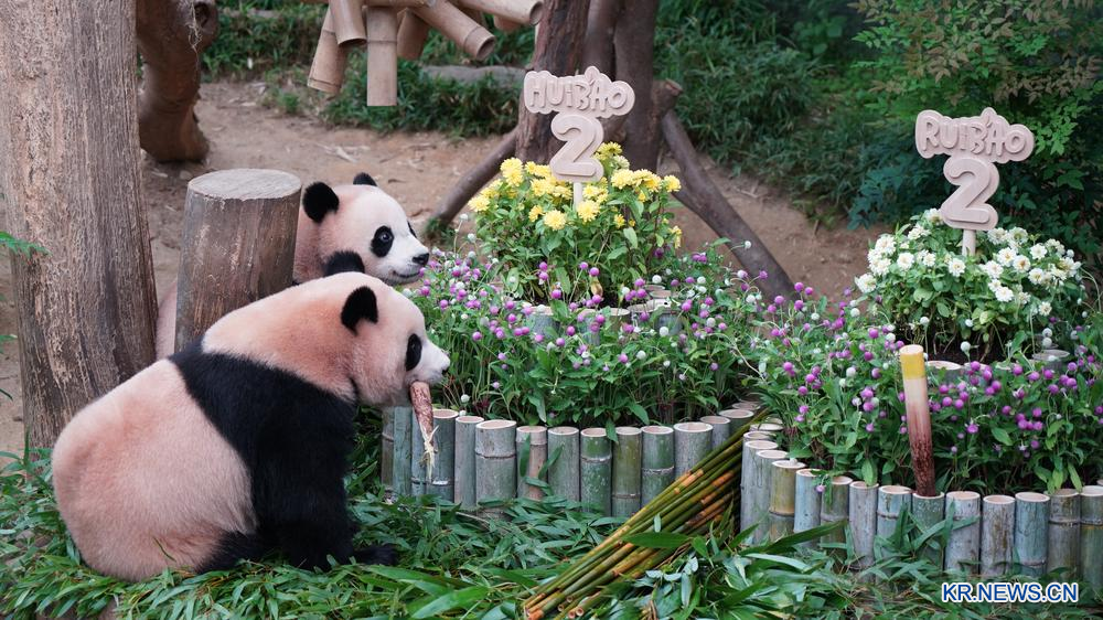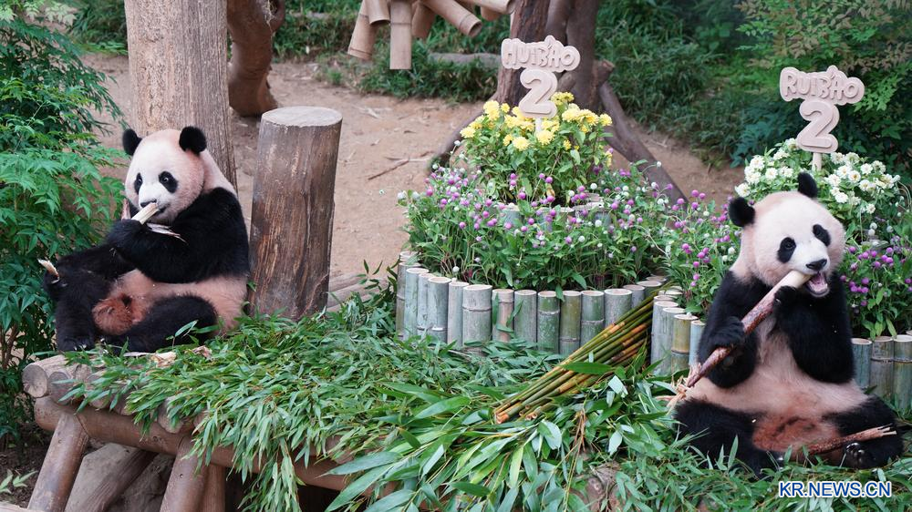 [신화망 용인 7월8일] 한국에서 태어난 쌍둥이 자이언트판다 '루이바오(睿寶)'와 '후이바오(輝寶)'가 7일 두 돌 생일을 맞았다. 한국 에버랜드는 이들 판다 자매를 위해 생일잔치를 열어줬다.