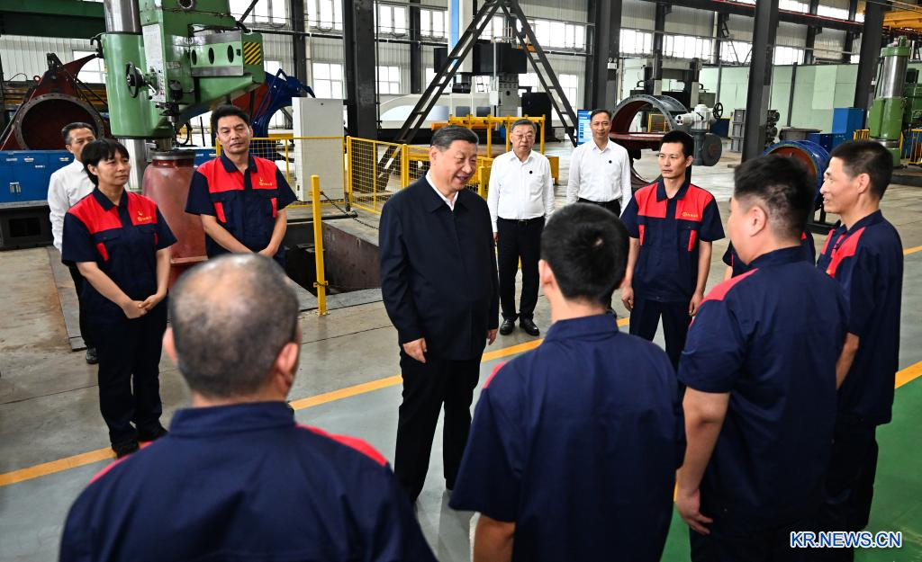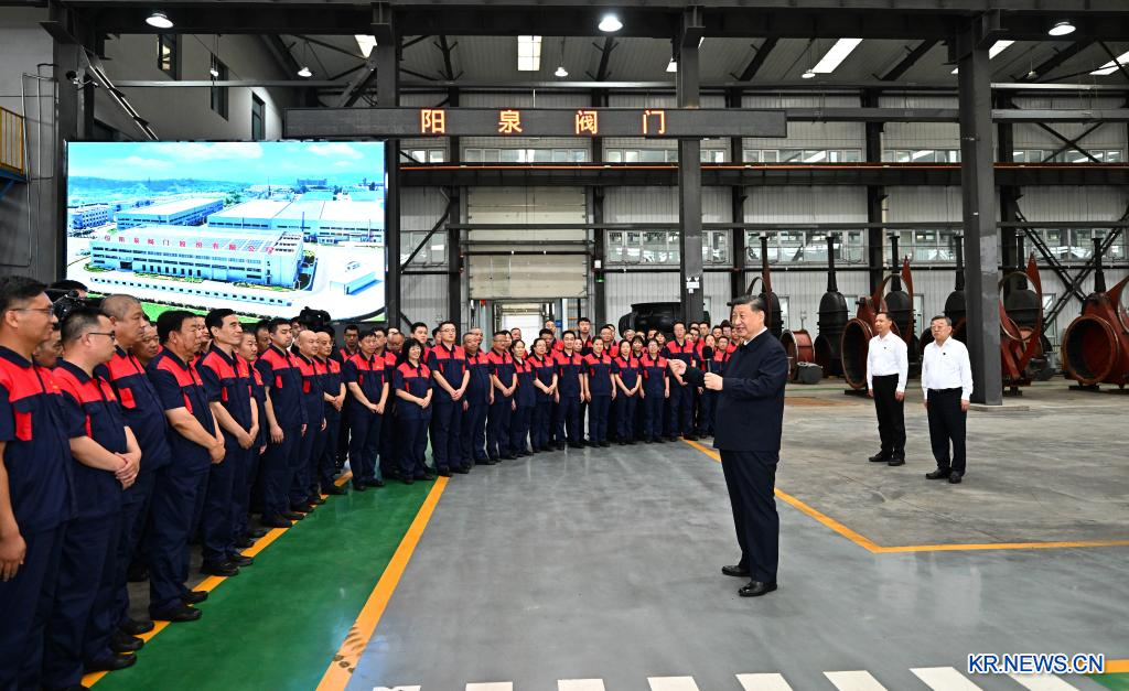 시진핑(習近平) 중국 공산당 중앙위원회 총서기, 국가주석, 중앙군사위원회 주석이 7~8일 산시(山西)성을 시찰했다.7일 오후 양취안(陽泉)시에 있는 밸브 제조업체를 방문한 시진핑 주석이 직원들과 이야기를 나누고 있다. [촬영/신화사 기자 자이젠란(翟健岚)]