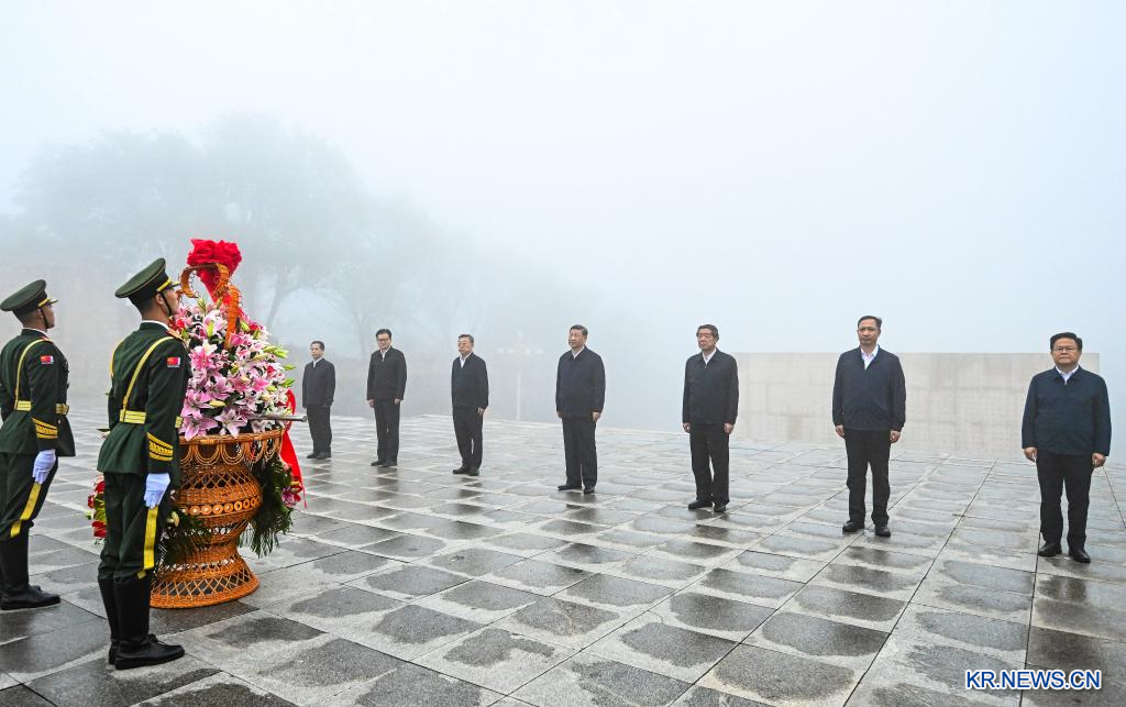 시진핑(習近平) 중국 공산당 중앙위원회 총서기, 국가주석, 중앙군사위원회 주석이 7~8일 산시(山西)성을 시찰했다. 7일 오후 시진핑 주석이 양취안(陽泉)시 스나오(獅腦)산에 위치한 백단대전(百團大戰) 기념비 광장에서 팔로군 열사들에게 헌화하고 있다. [촬영/신화사 기자 옌옌(燕雁)]