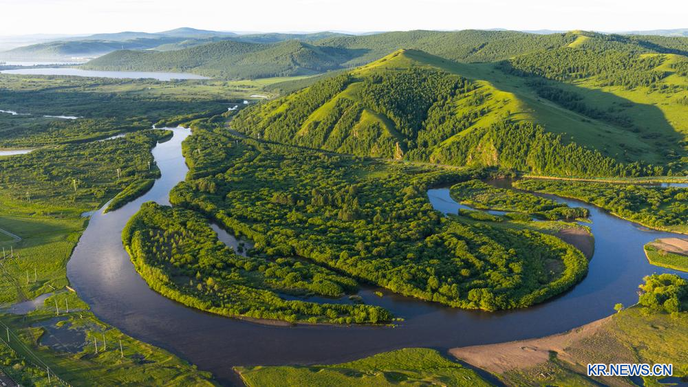 [신화망 후룬베이얼 7월13일] 네이멍구(內蒙古)자치구 후룬베이얼(呼倫貝爾)시에 위치한 몐두허(免渡河)국가습지공원이 한여름에 들어서면서 그림 같은 풍경을 자아내고 있다.