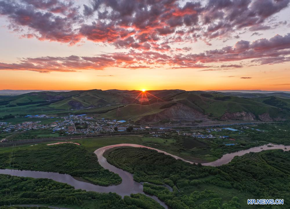 11일 네이멍구(內蒙古)자치구 후룬베이얼(呼倫貝爾)시에 위치한 몐두허(免渡河)국가습지공원의 일출을 드론에 담았다.