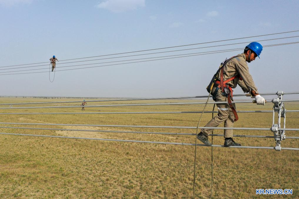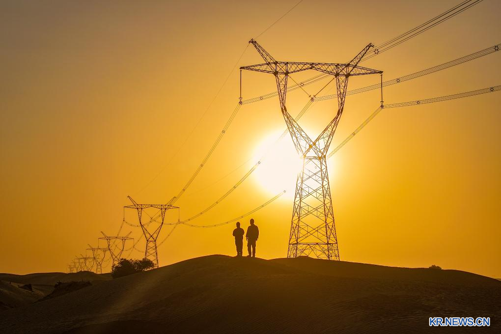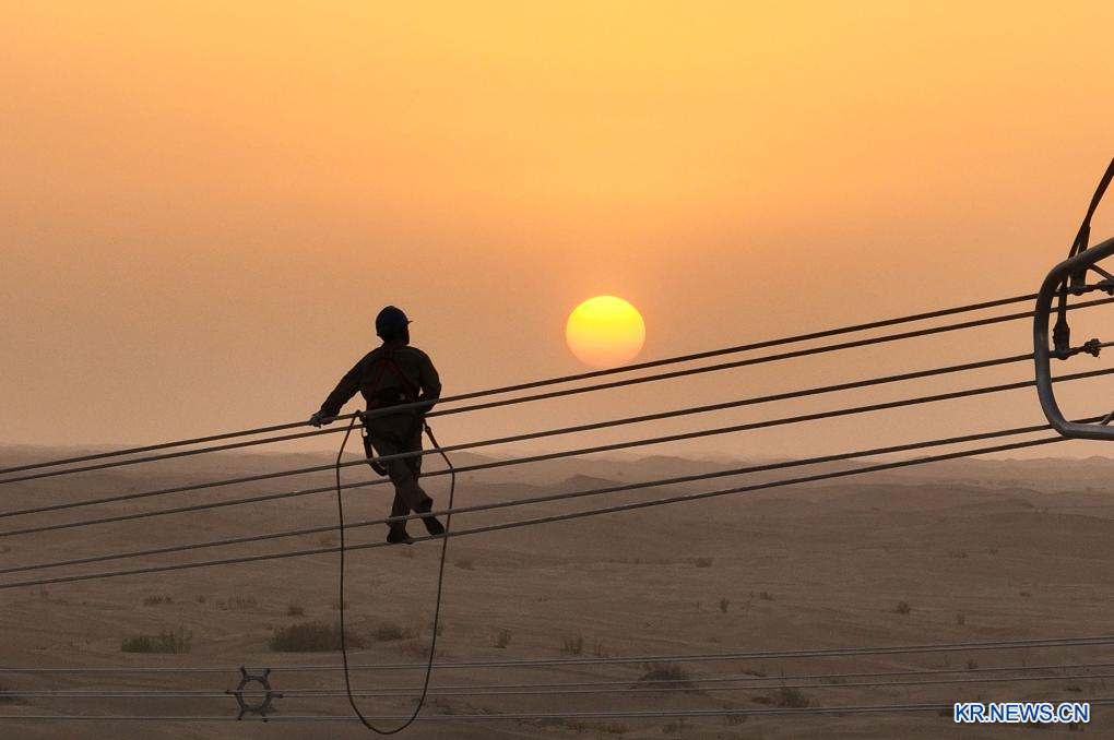 [신화망 민펑 7월14일] 13일 신장위구르자치구 타리무(塔里木∙타림) 분지 남쪽 가장자리에 있는 허톈(和田) 지역 민펑현에서 견인기가 마지막 구간의 전선을 183호 철탑에서 188호 철탑으로 끌어당기는 데 성공했다. 이로써 공사에 15년이 걸린 타리무 분지 주변 750㎸(킬로볼트) 송변전 프로젝트가 전 구간 연결되면서 타리무 분지를 둘러싼 750㎸ 초고압 송전 환상망이 구축됐다.