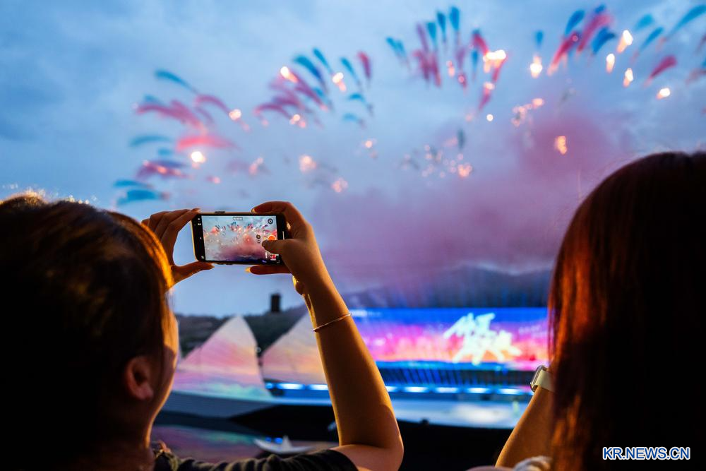 12일 관광객이 후난(湖南)성 류양(瀏陽)시 톈쿵(天空)극원에 펼쳐진 불꽃쇼를 촬영하고 있다.