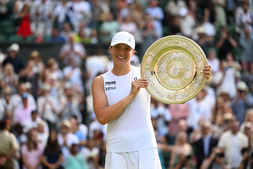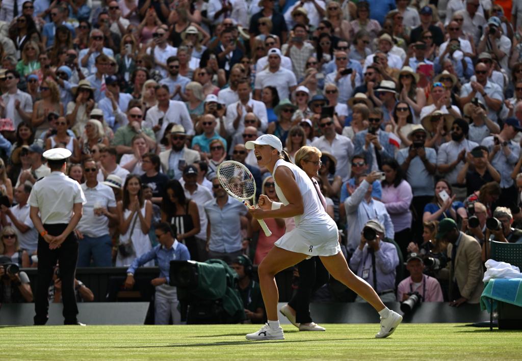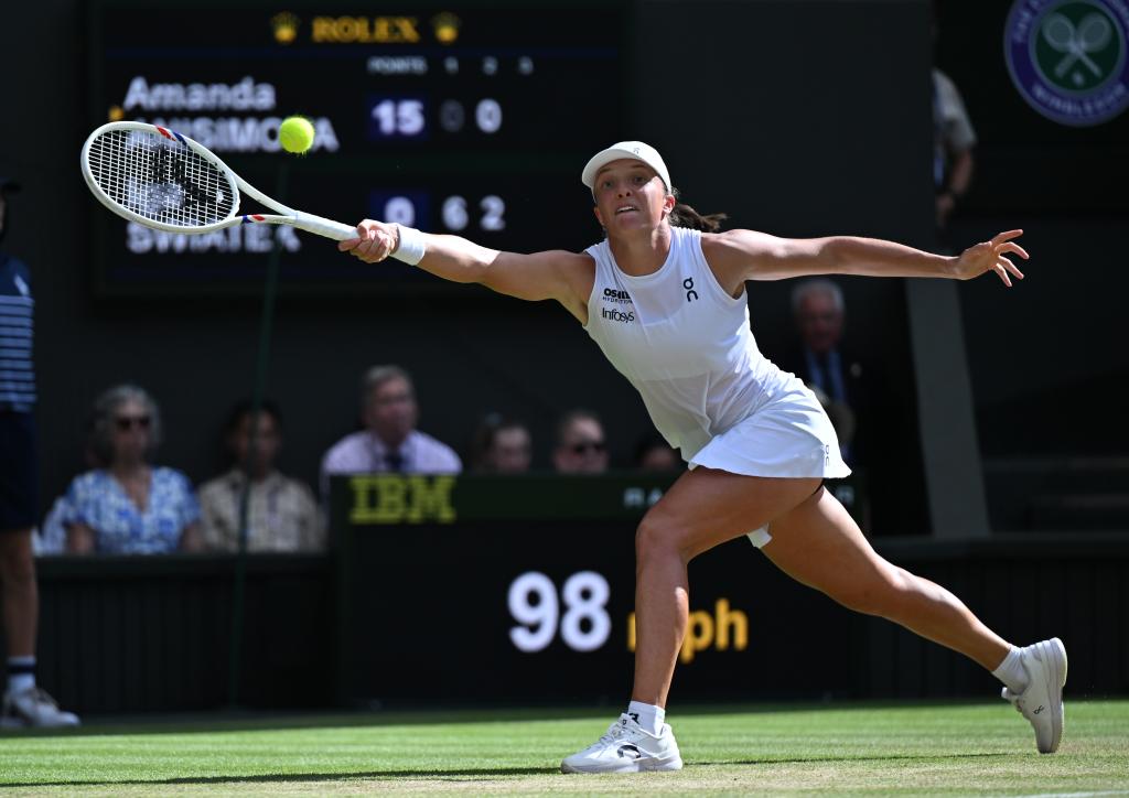 이가 시비옹테크가 12일(현지시간) 영국 런던에서 열린 2025 윔블던 테니스 대회 여자 단식 결승에서 어맨다 아니시모바(미국)를 2-1으로 완파하고 우승을 차지했다.[촬영/신화사 기자 자오딩저(趙丁喆)]