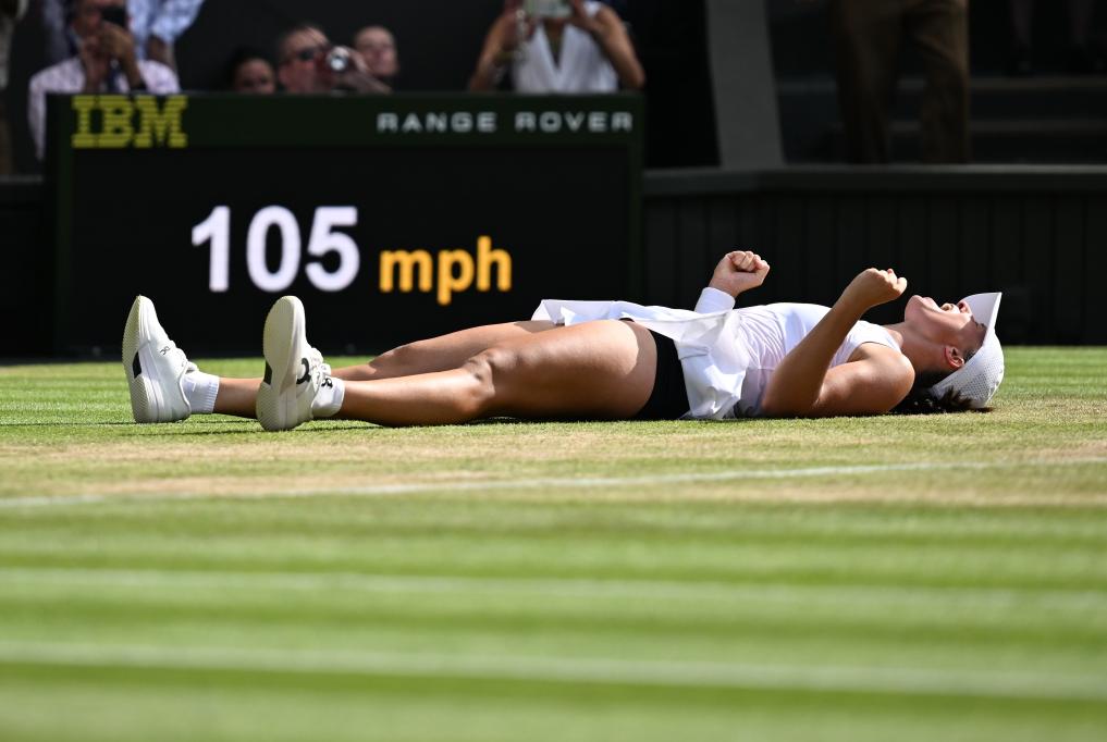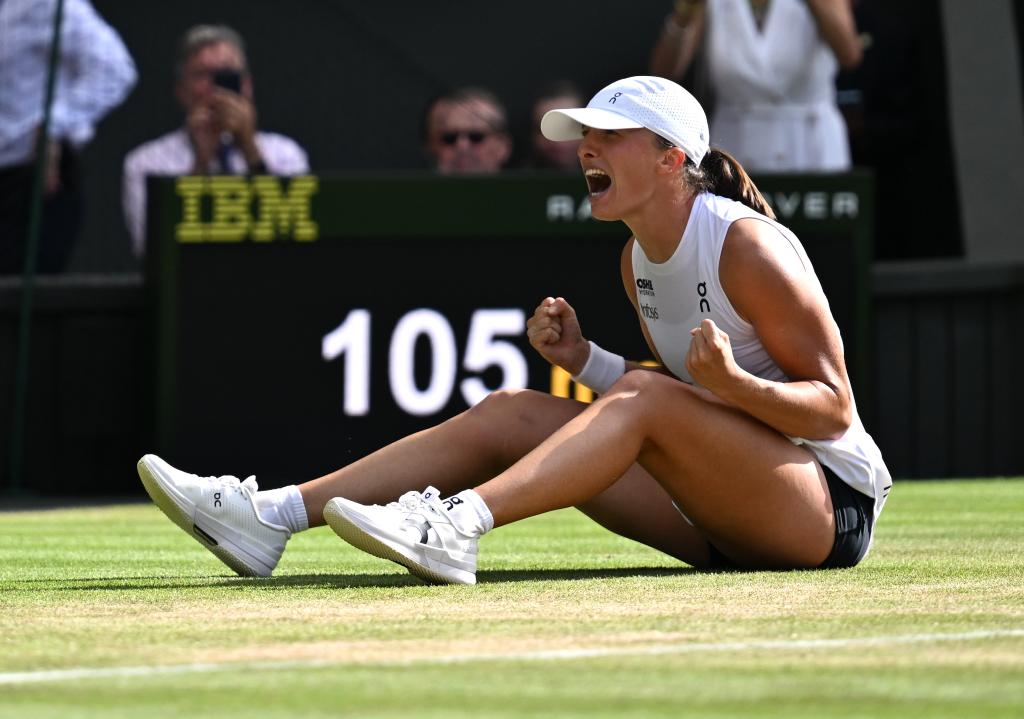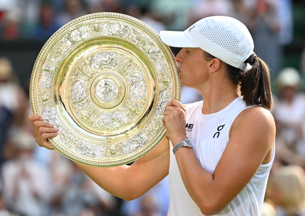 [신화망 런던 7월14일] 이가 시비옹테크가 12일(현지시간) 영국 런던에서 열린 2025 윔블던 테니스 대회 여자 단식 결승에서 어맨다 아니시모바(미국)를 2-1으로 완파하고 우승을 차지했다.[촬영/신화사 기자 자오딩저(趙丁喆)]
