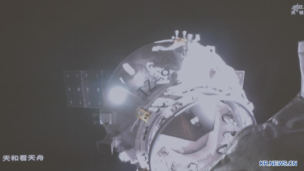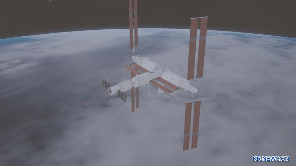 [신화망 베이징 7월15일] 중국 화물우주선 톈저우(天舟) 9호와 우주정거장 모듈이 랑데부·도킹에 성공했다. 사진은 15일 베이징우주통제센터(BACC)에서 촬영한 톈저우 9호가 우주정거장에 접근하는 장면.