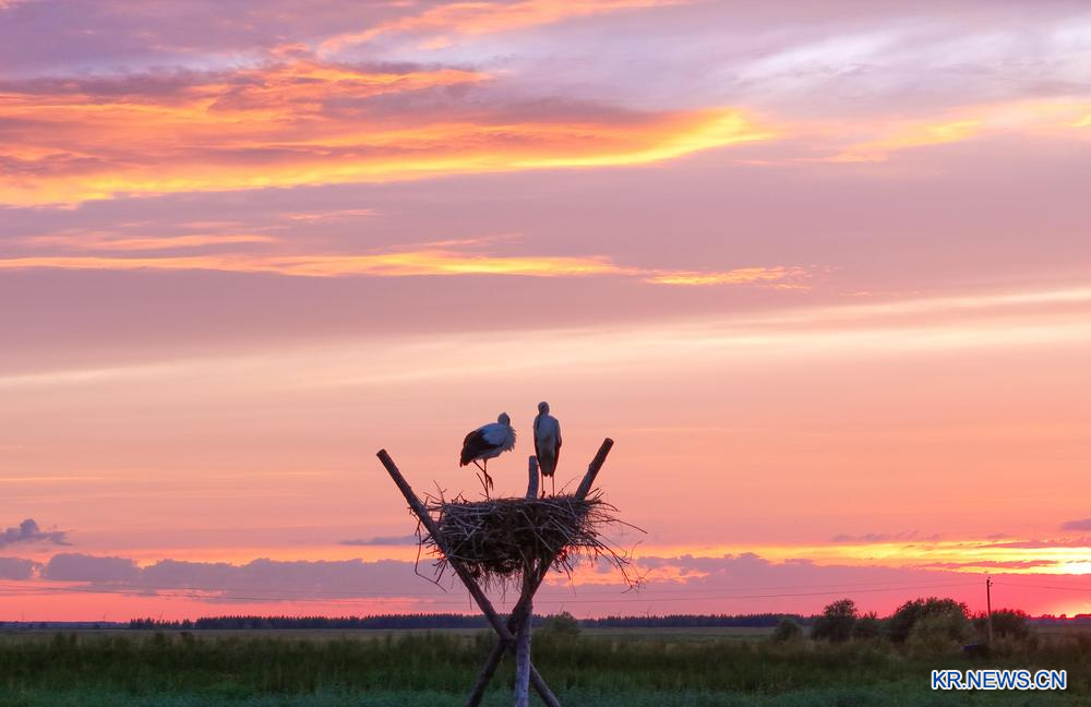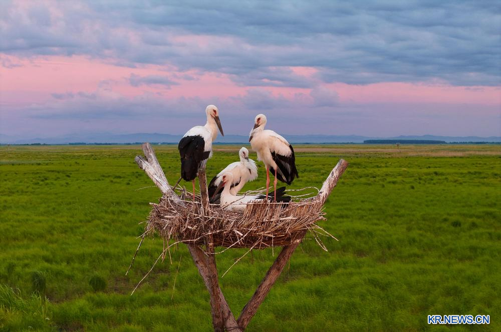 한여름, 헤이룽장성 푸진(富錦)에 위치한 싼환파오 국가급자연보호구의 인공 둥지 안에서 자란 황새 새끼들이 둥지를 떠날 준비를 하고 있다. 보호구 관리국에 따르면 올해 뤄마후(落馬湖) 관리보호소에 설치된 20개의 인공 둥지에 모두 황새가 찾아와 70여 마리의 새끼를 부화했다. 2025.7.14