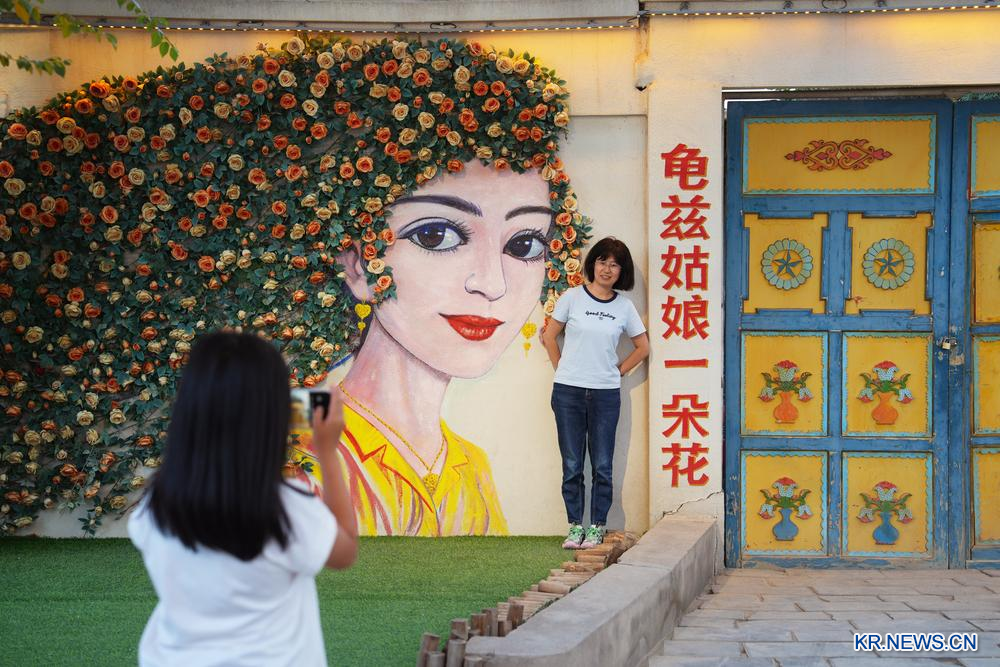17일 신장(新疆)위구르자치구 쿠처(庫車)시에 위치한 구자(龜茲)골목에서 인증샷을 찍는 관광객.