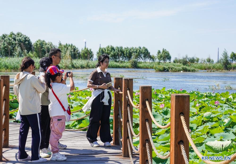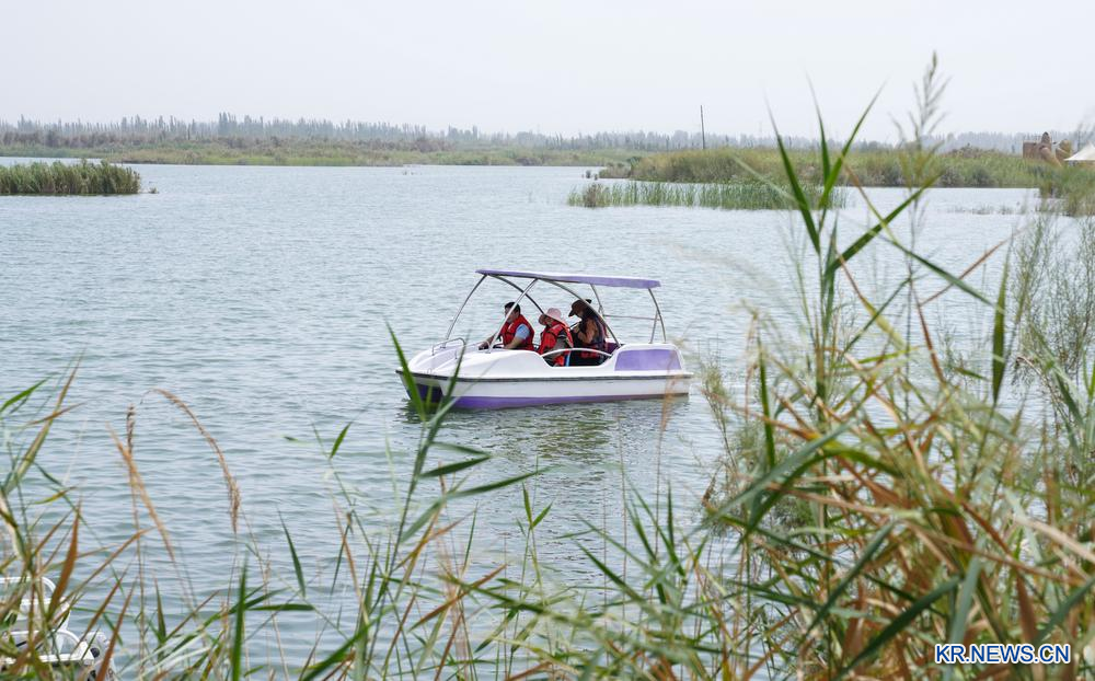 [신화망 우루무치 8월12일] 10일 마나쓰(瑪納斯) 국가습지공원을 찾은 관광객들.