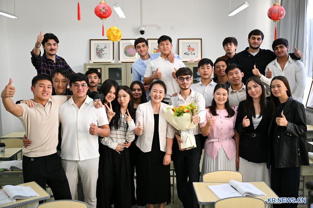 이날 신장(新疆)사범대학 국제문화교류학원에서 유학생들이 중국어 교사에게 꽃을 선물한 후 함께 사진을 찍고 있다. 2025.9.10