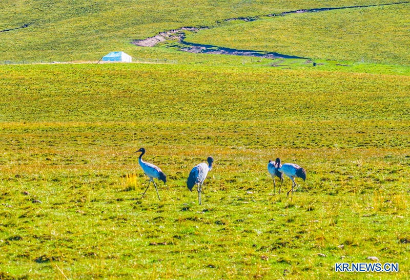 만쩌탕(漫澤塘)습지대초원을 유유자적 거니는 검은목두루미.